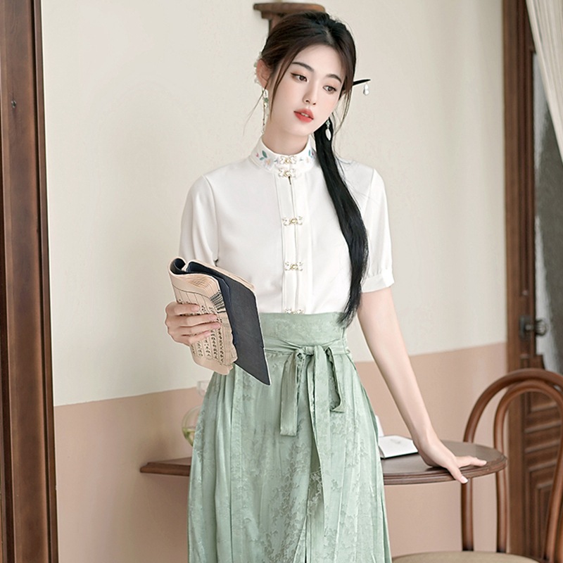 夏季新款新中式刺绣纽扣复古短袖上衣高档提花汉服马面裙套装
