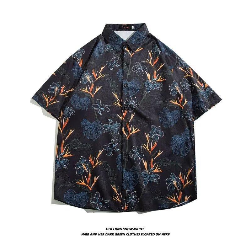 美式街头嘻哈满印短袖花衬衫男夏季新款潮流时尚复古休闲半袖衬衣