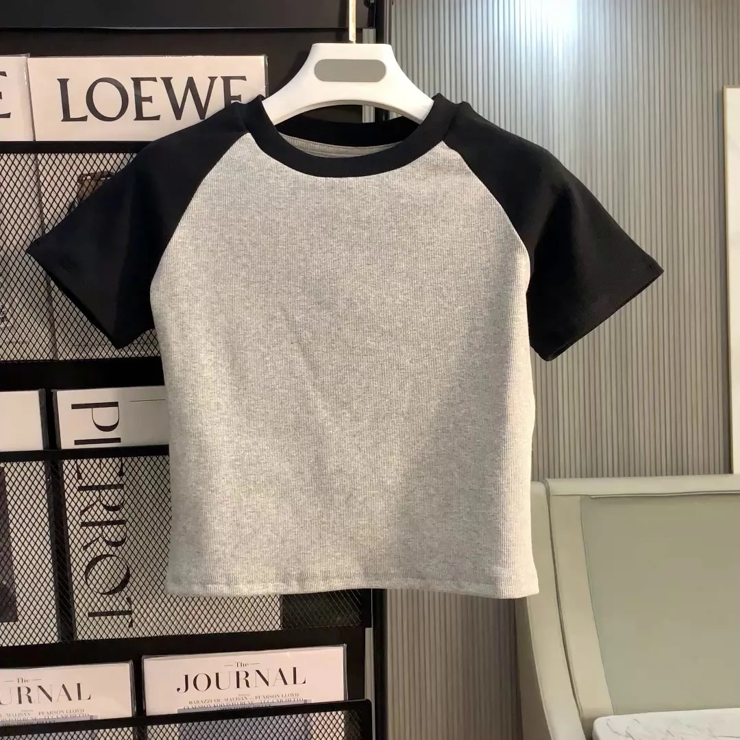 撞色拼接复古港风短袖t恤女夏季新款修身显瘦气质百搭辣妹上衣ins