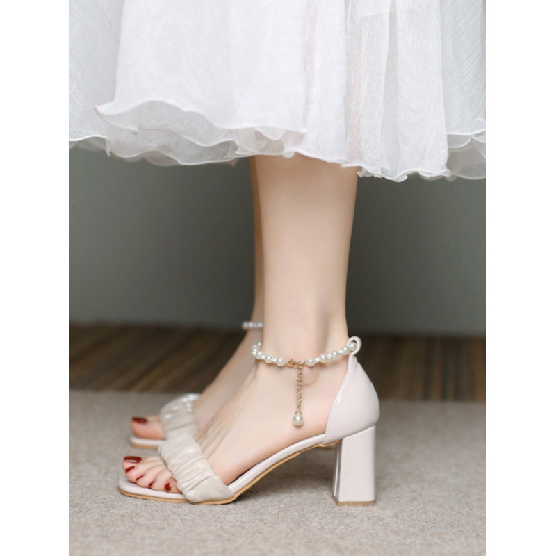 高跟温柔带仙女凉鞋女款年风百搭夏季罗马一字珍珠粗跟妞跨境