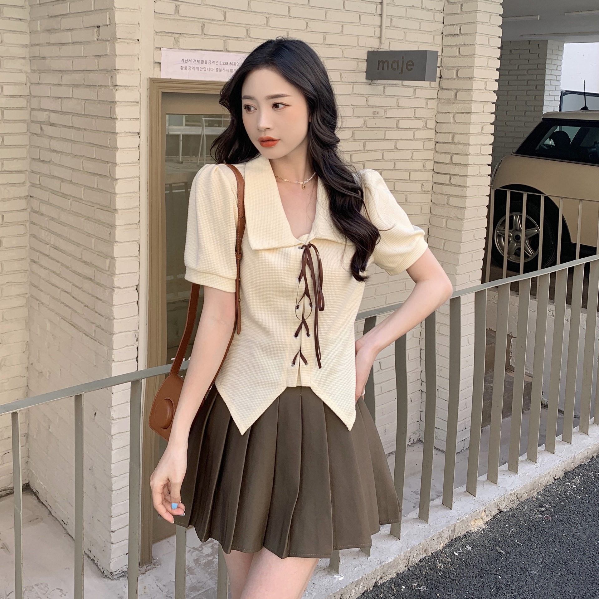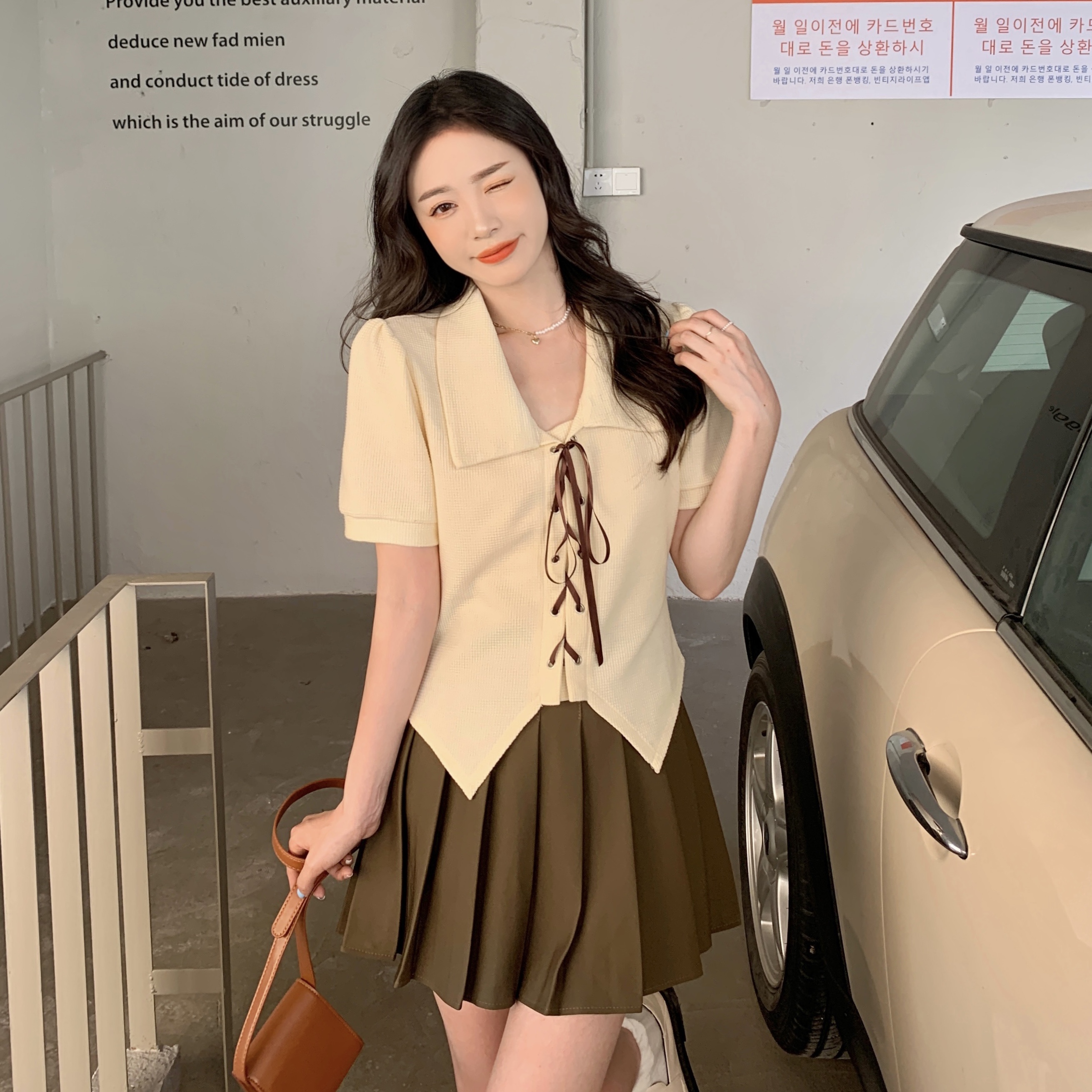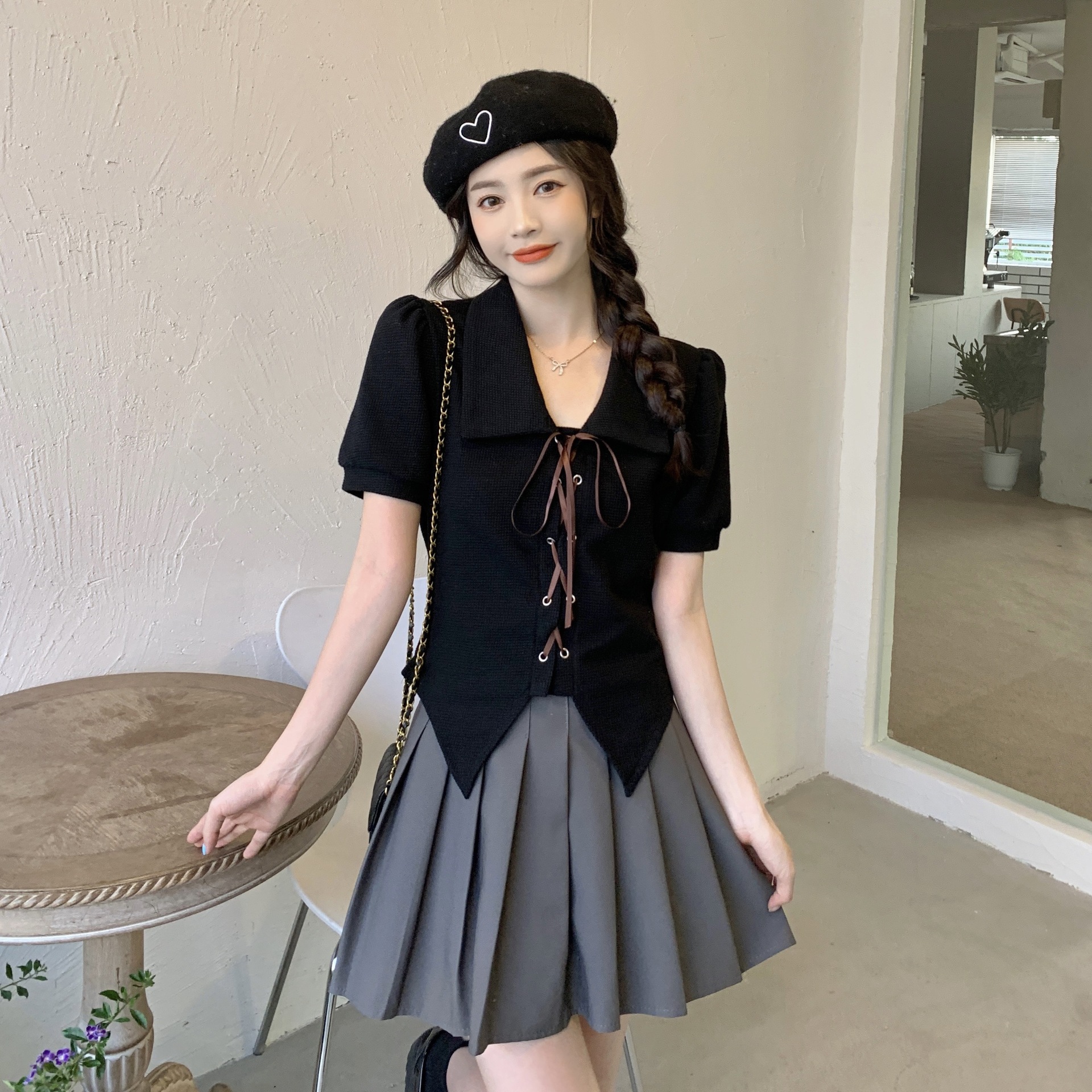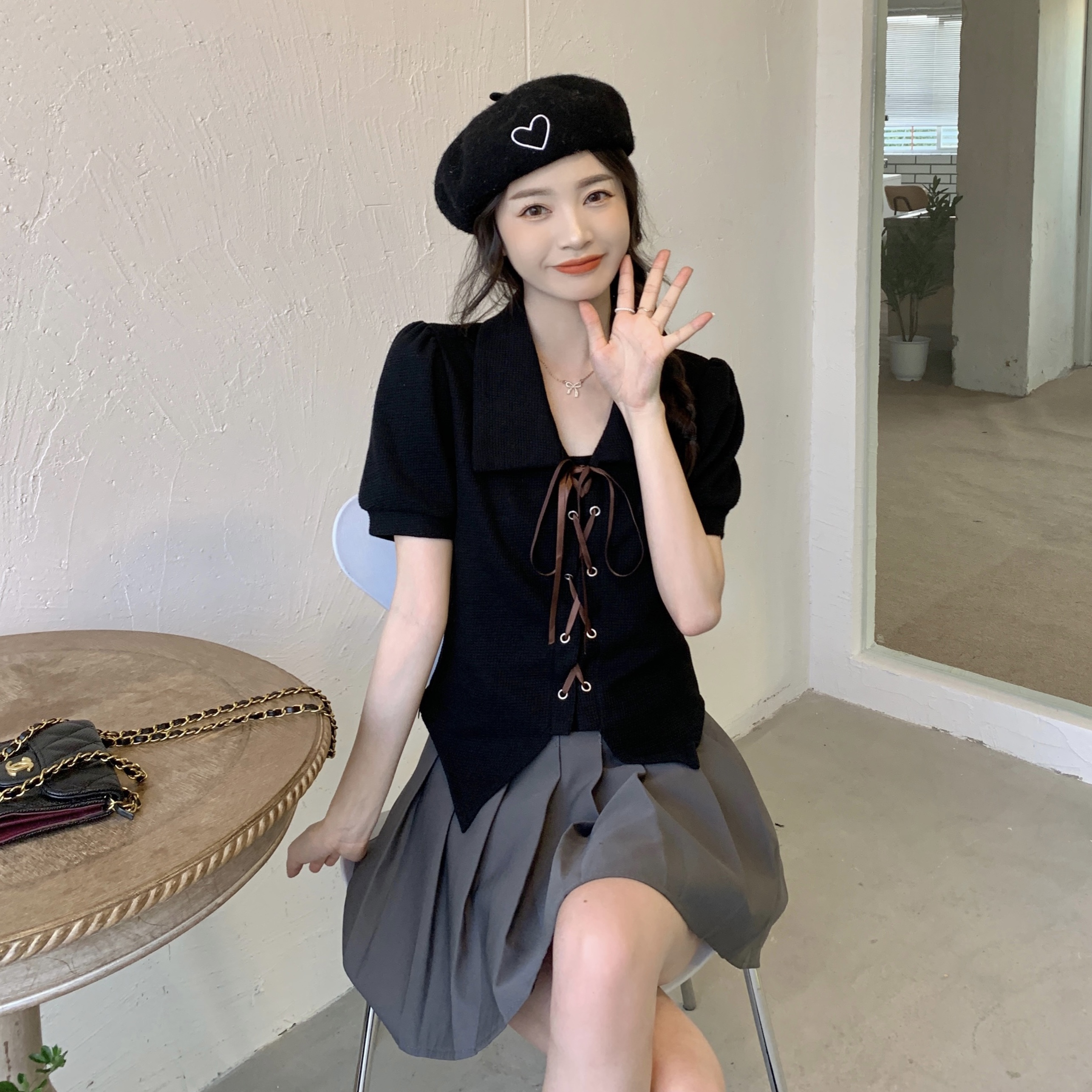 春夏女新款小清新穿搭针织衫修身翻领彩色纽扣短袖上衣