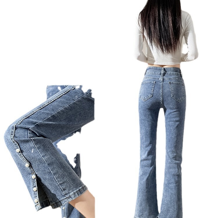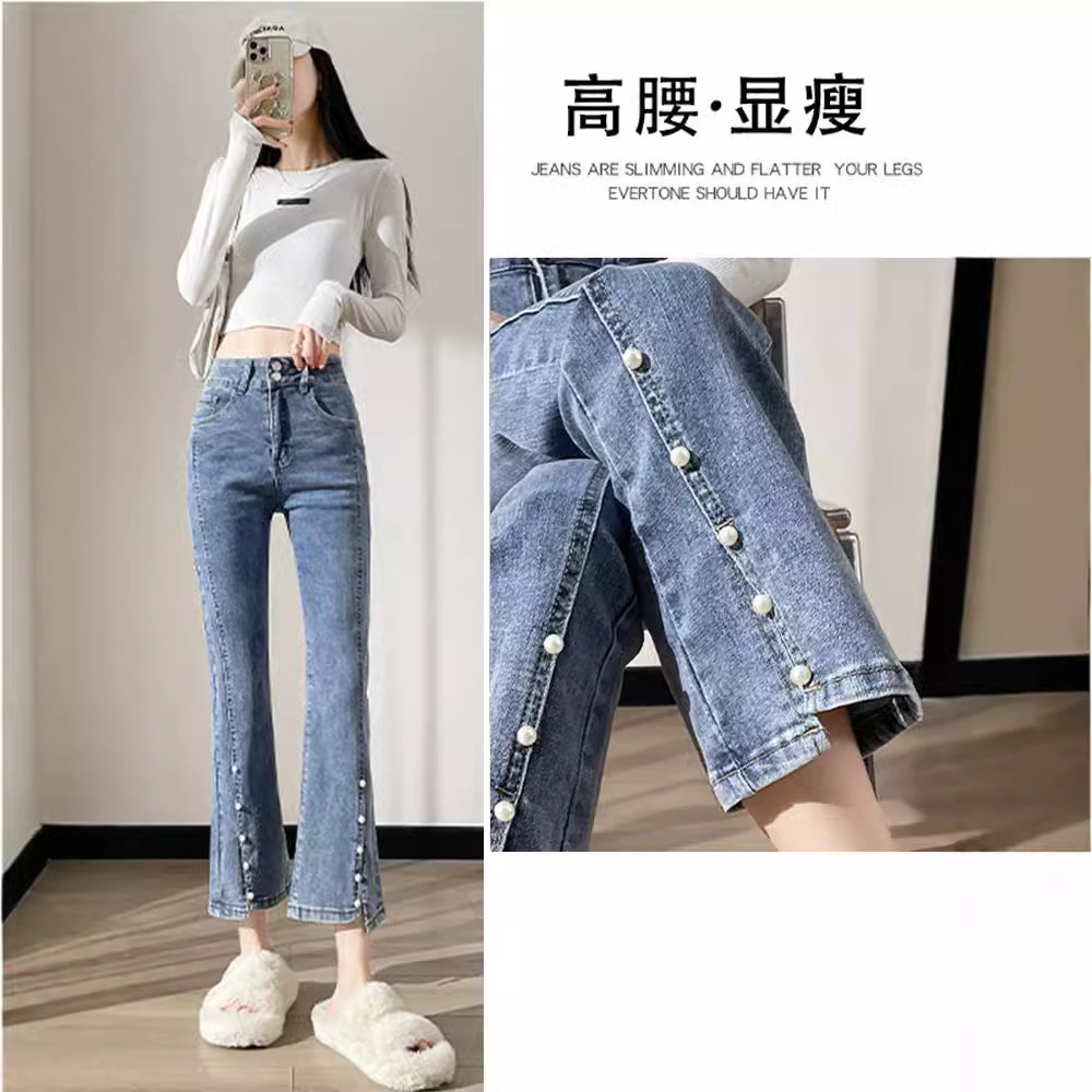 大码高腰显瘦牛仔裤女春季新款胖mm小个子直筒九分开叉微喇裤