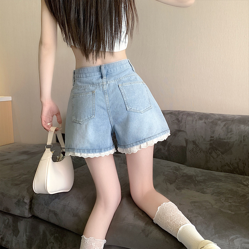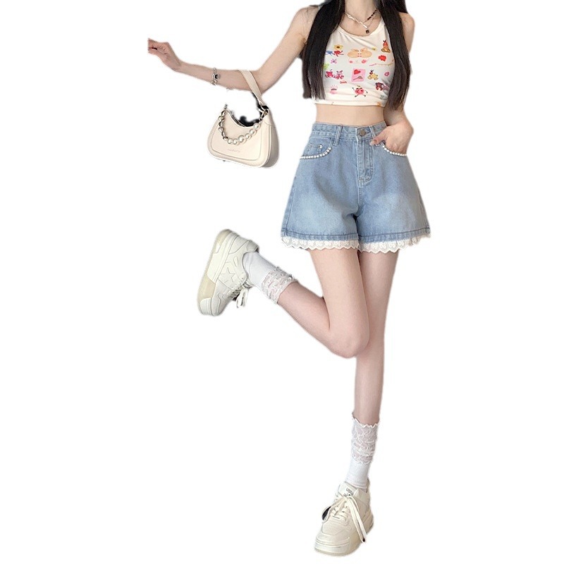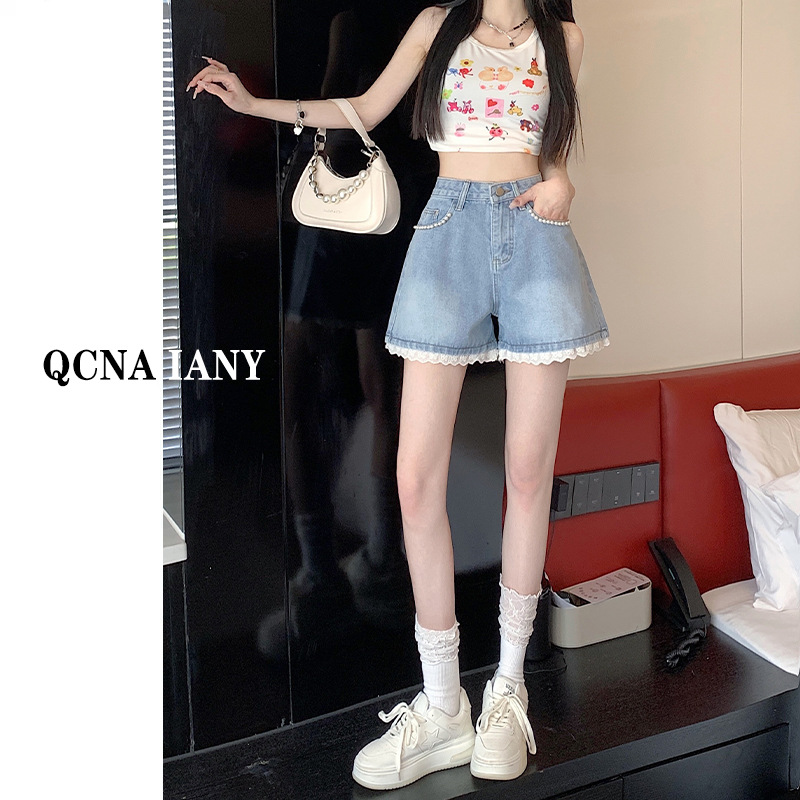 甜辣chic牛仔短裤女夏季高腰显瘦阔腿A字大码百搭小个子钉珠花边