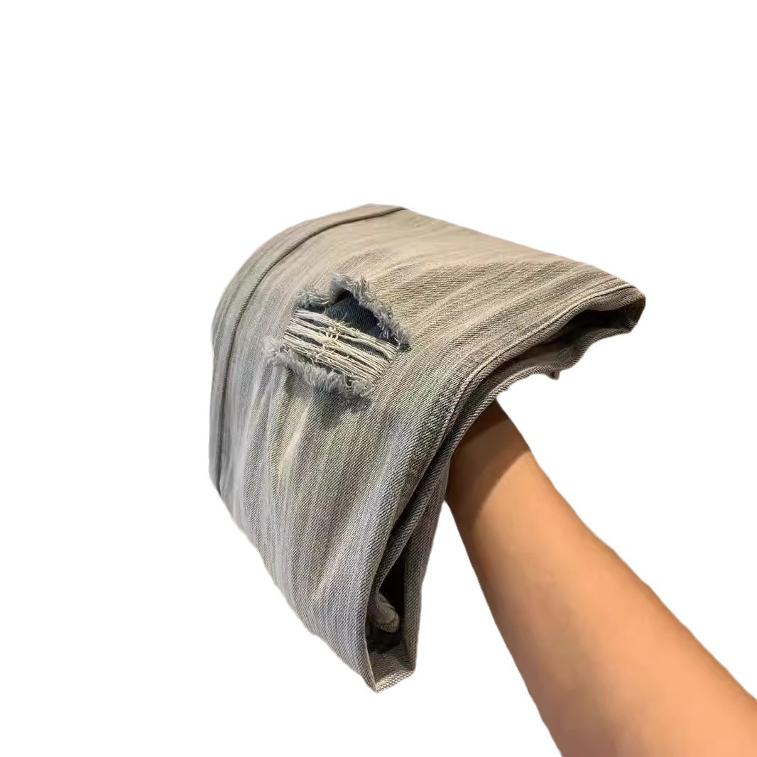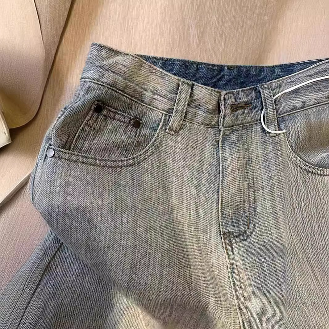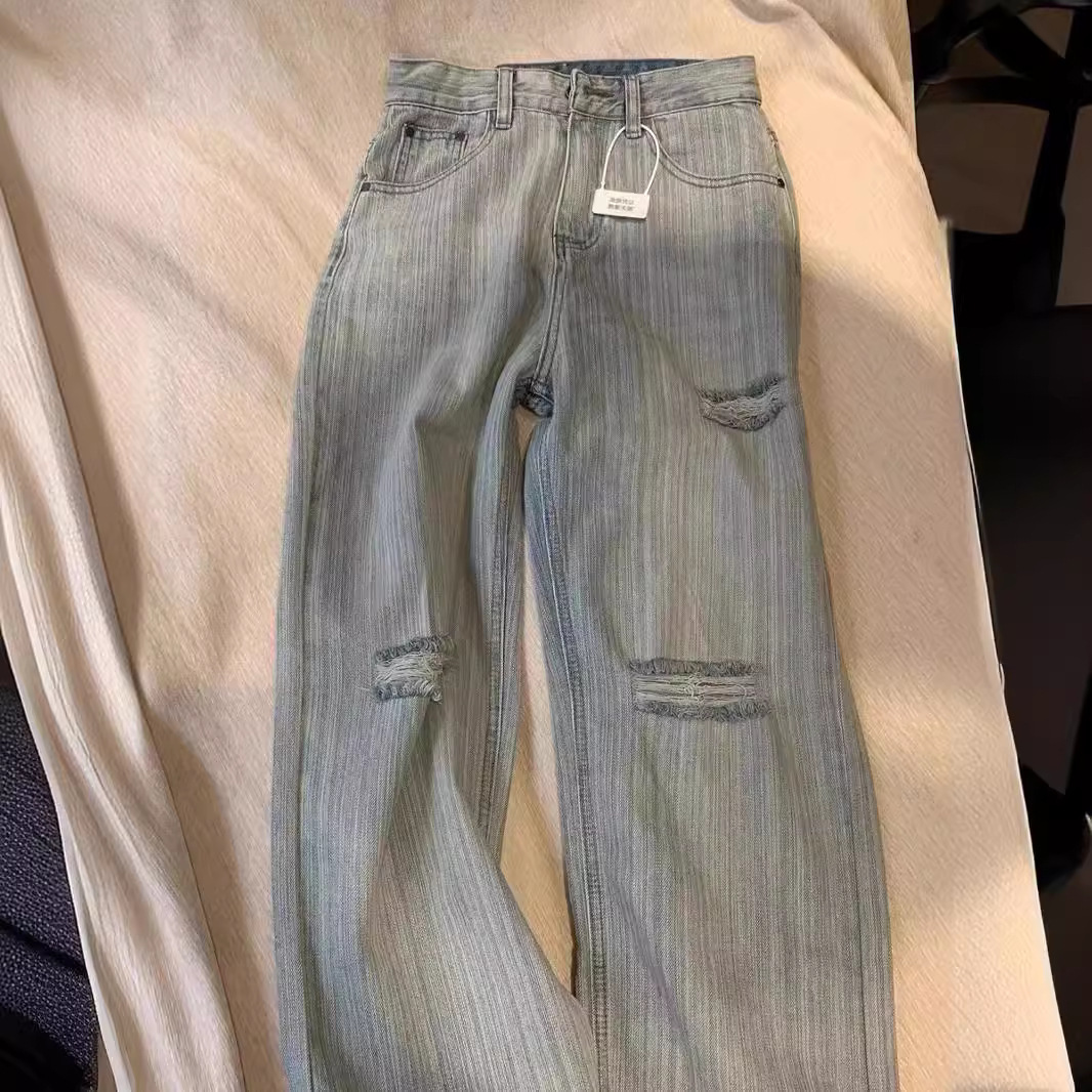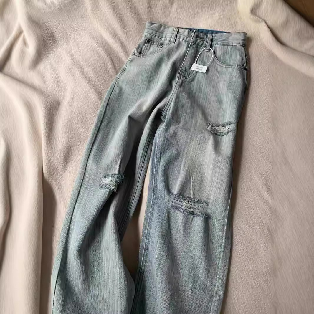 大码复古破洞牛仔裤女夏季高腰显瘦宽松百搭垂感直筒阔腿拖地裤子