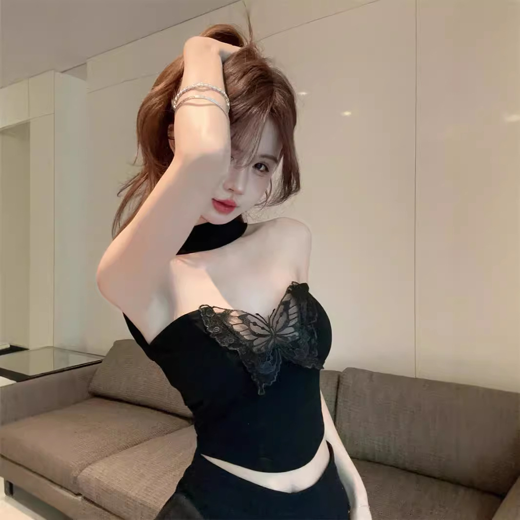 辣妹挂脖镂空重工蝴蝶刺绣显瘦性感短款吊带背心小上衣女夏季外穿