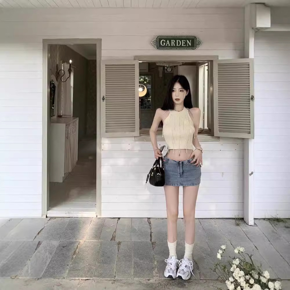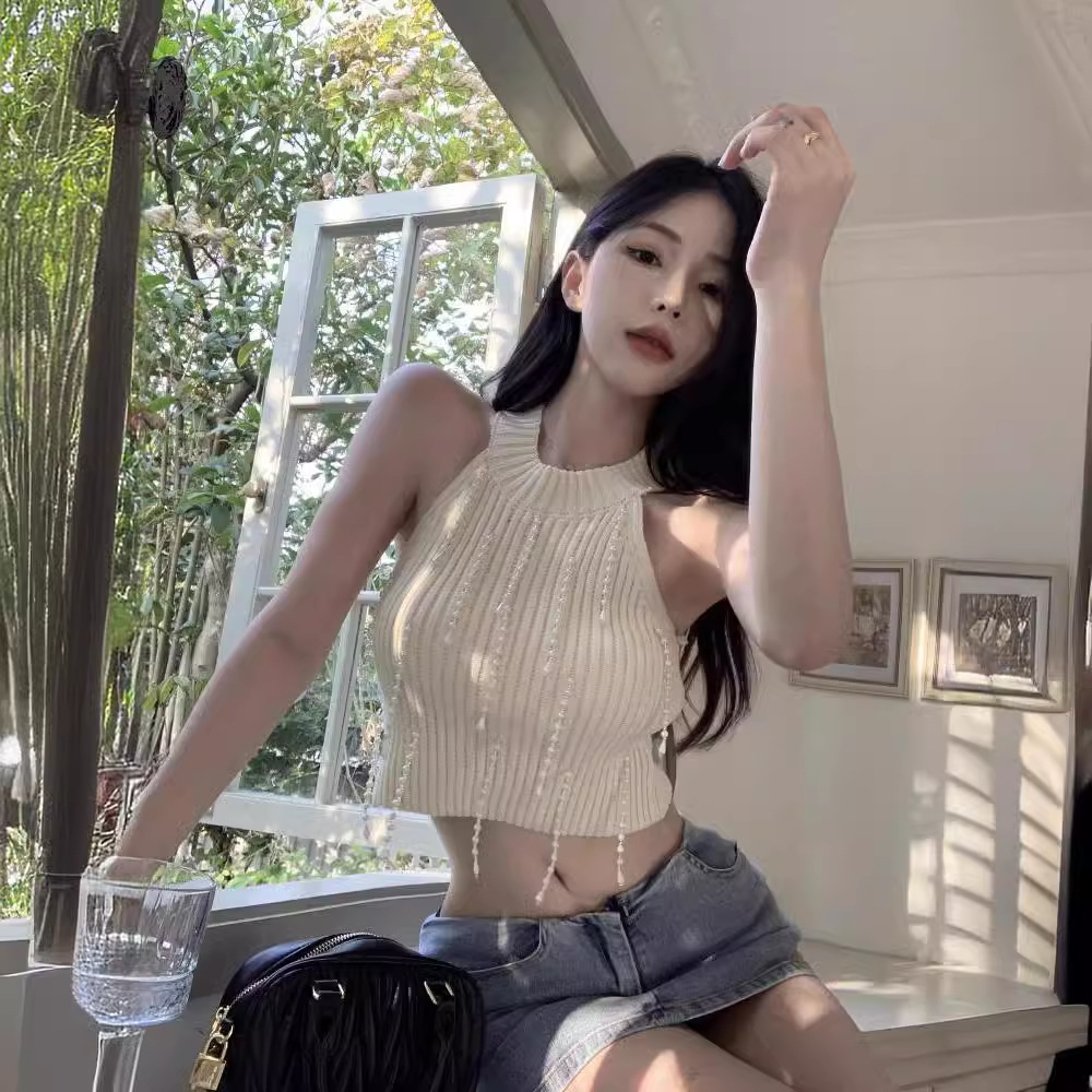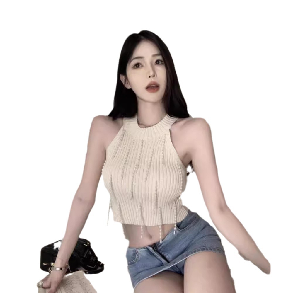 小香风珍珠挂坠露肩挂脖针织背心夏外穿海边度假纯欲甜辣内搭上衣