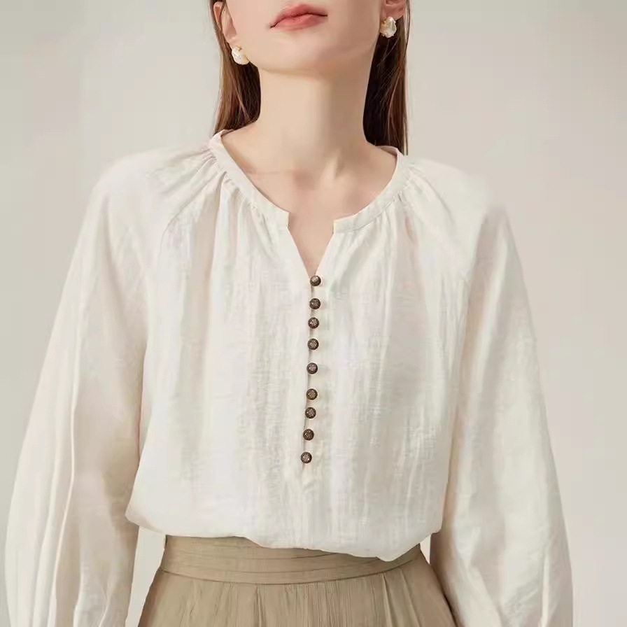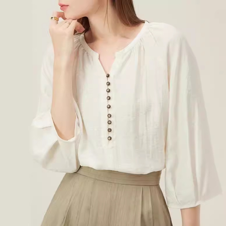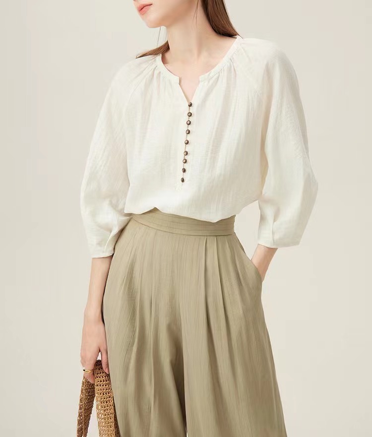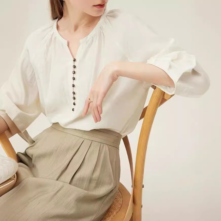 法式亚麻衬衫女夏款七分袖气质通勤上衣宽松慵懒风