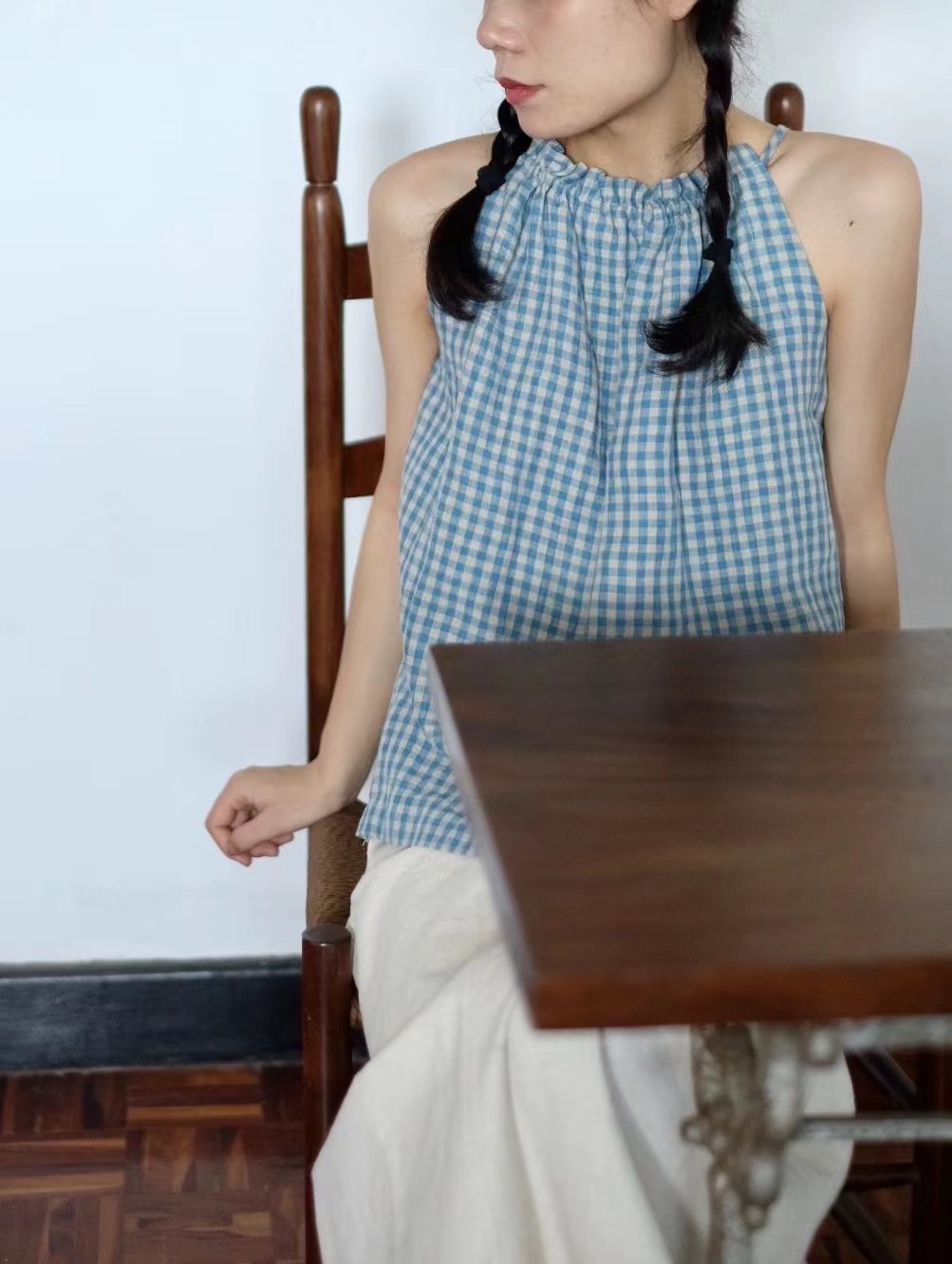 野梨树下 孔雀蓝砂洗亚麻格子抽绳无袖背心上衣衬衫