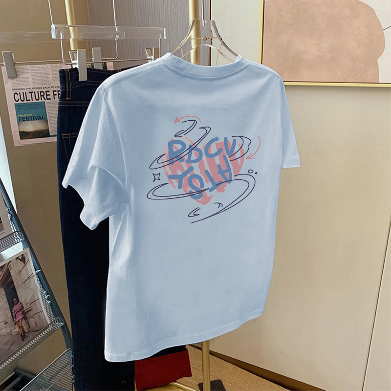 2025夏季新款蓝色纯棉短袖t恤女宽松百搭圆领爱心印花休闲上衣ins