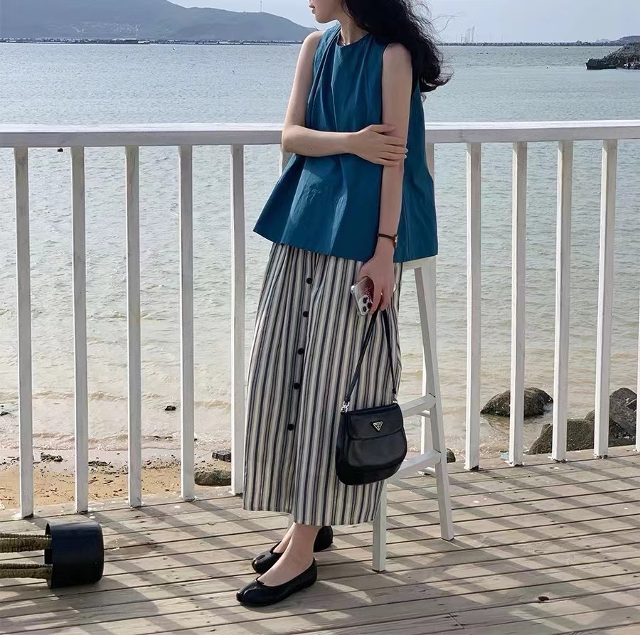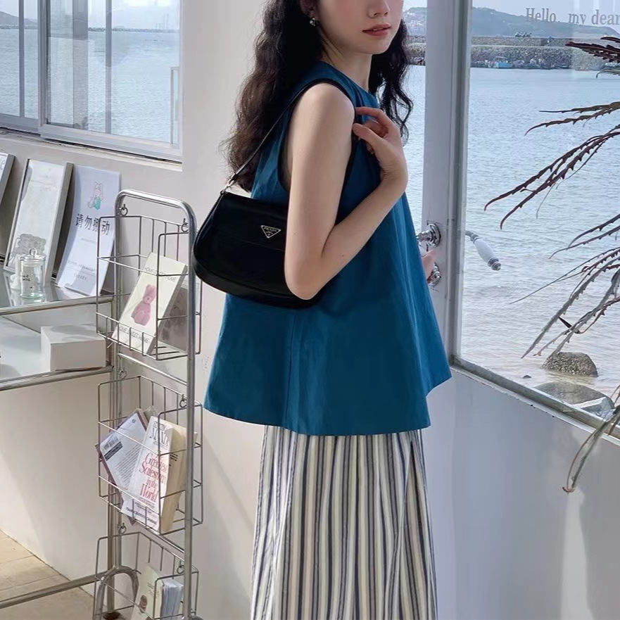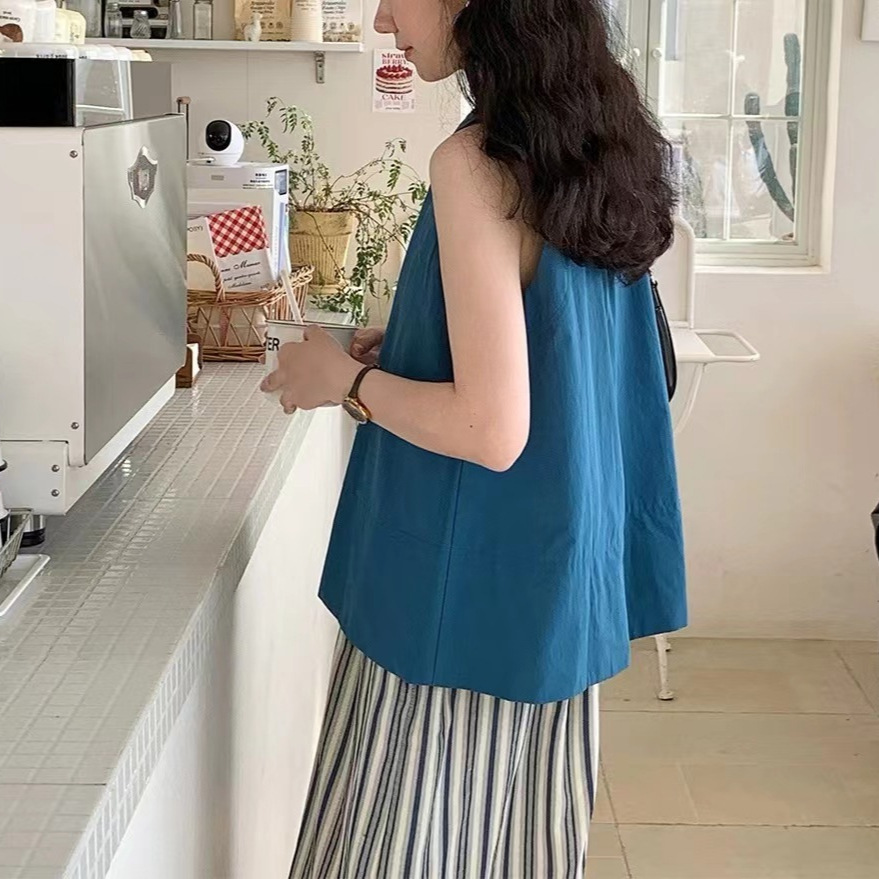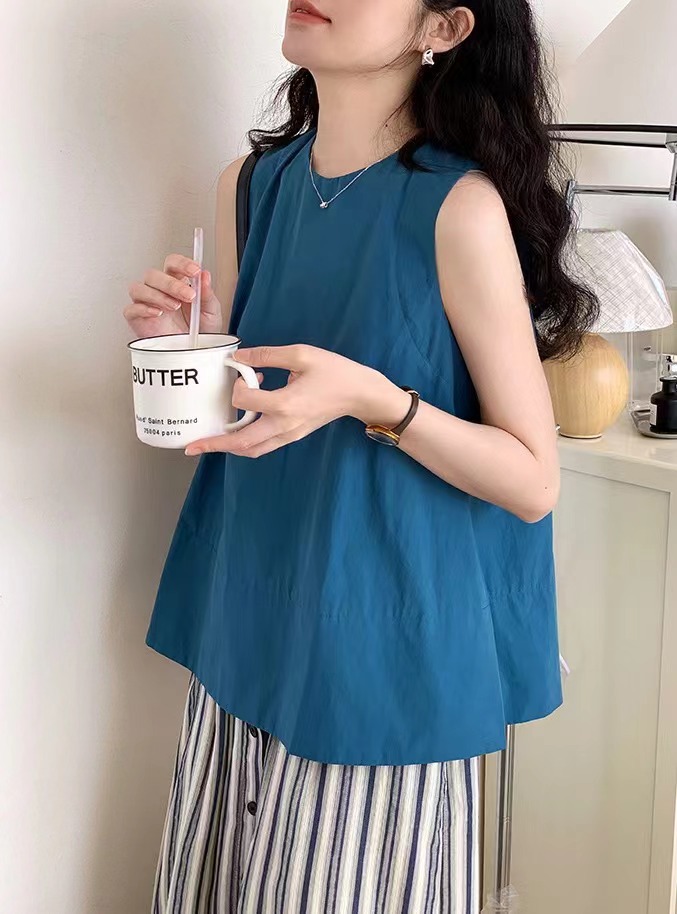 海岛小镇孔雀蓝简约圆领纯色背心娃娃衫夏季无袖上衣