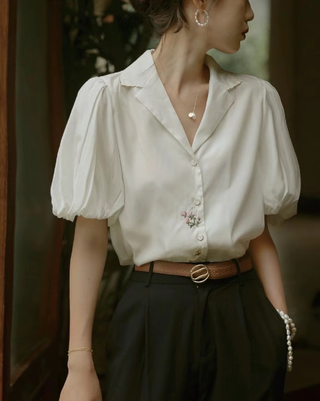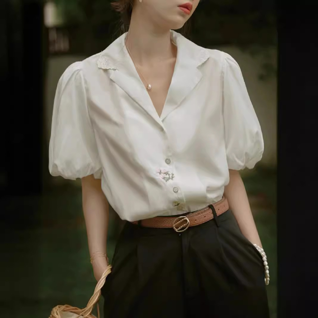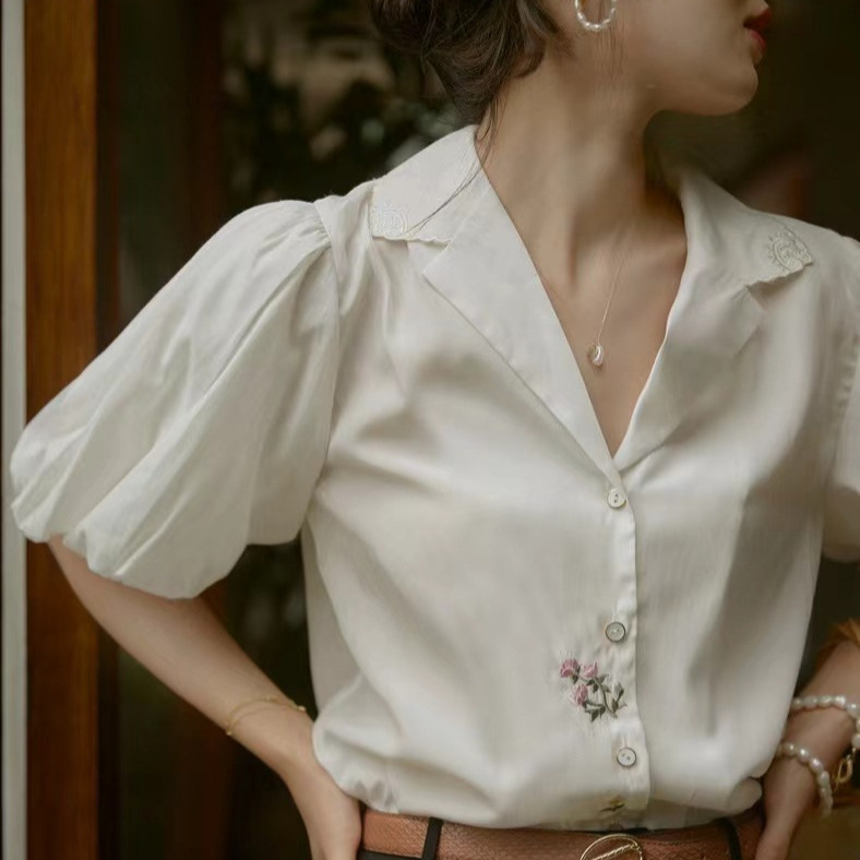 法式小众别致白色泡泡袖衬衫女夏时尚复古花朵刺绣小花苞上衣薄款