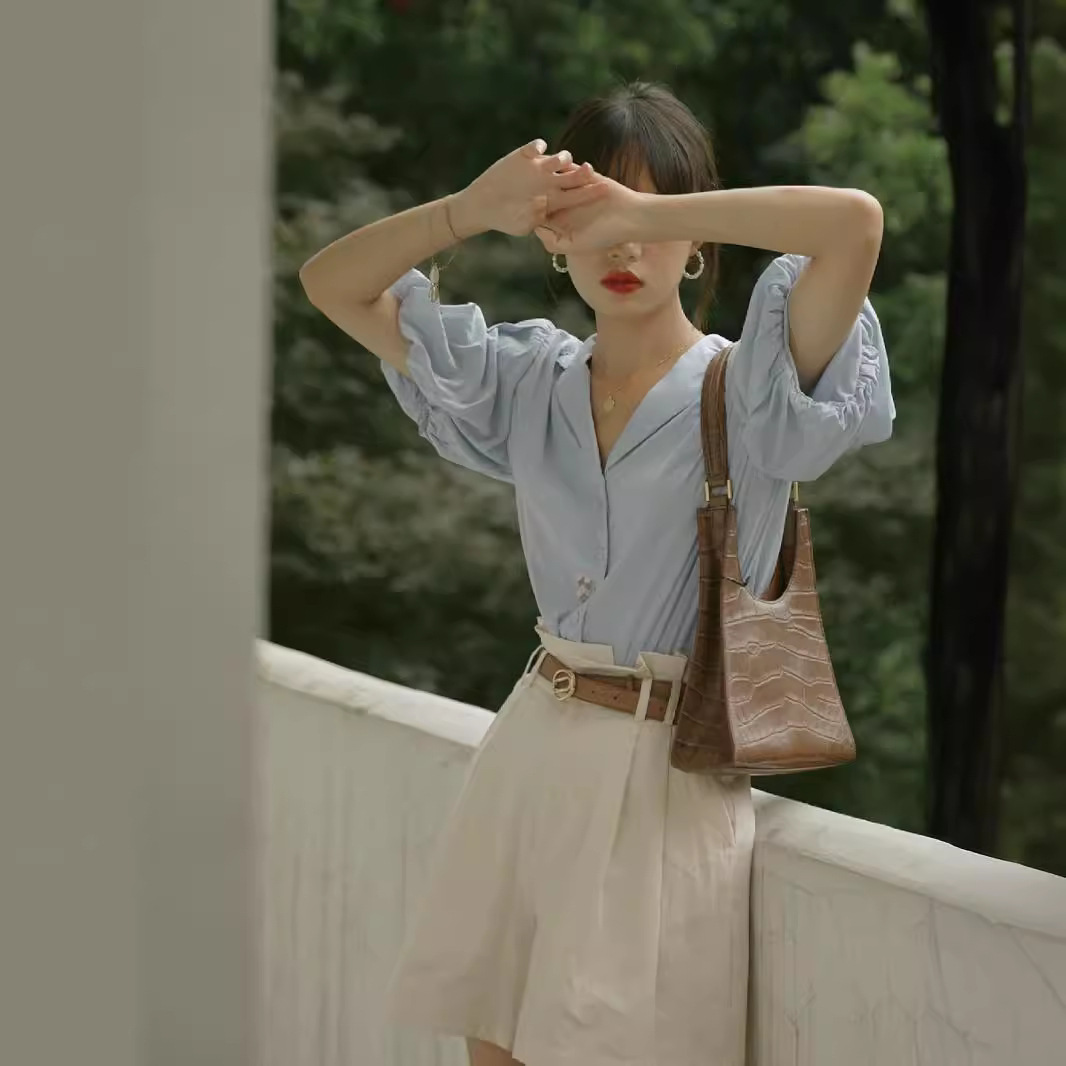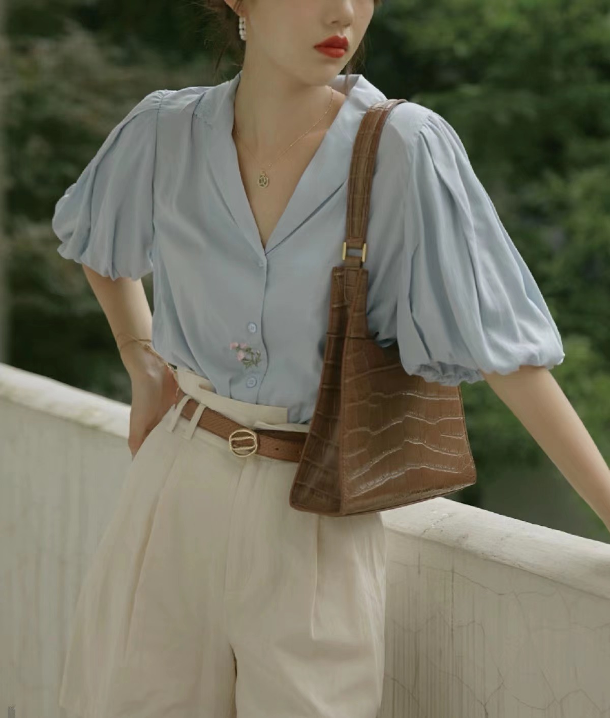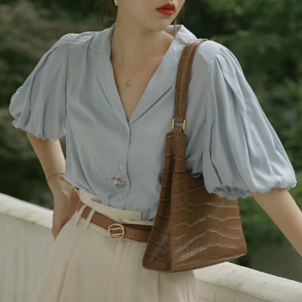 法式小众别致白色泡泡袖衬衫女夏时尚复古花朵刺绣小花苞上衣薄款