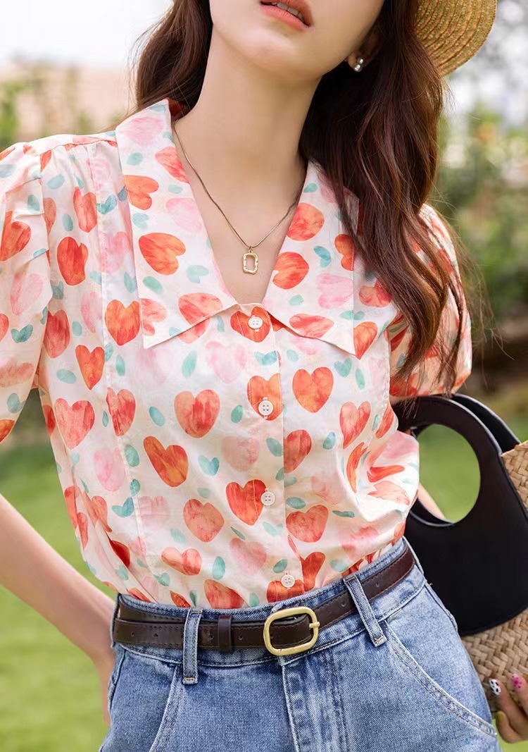 碎花爱心衬衫女宽松夏季新款法式复古甜美短袖洋气泡泡袖上衣