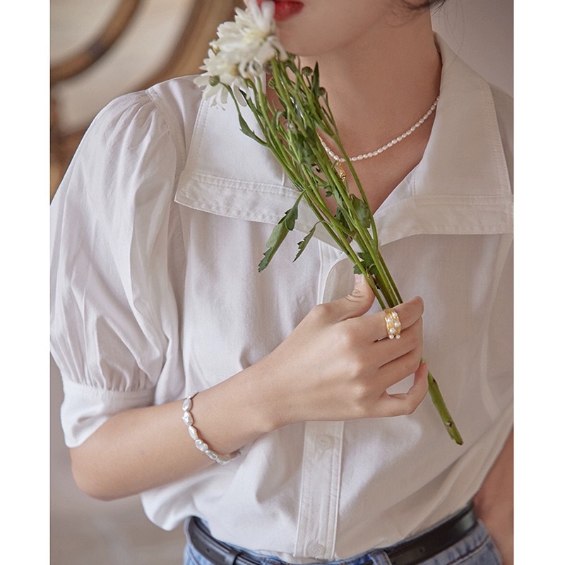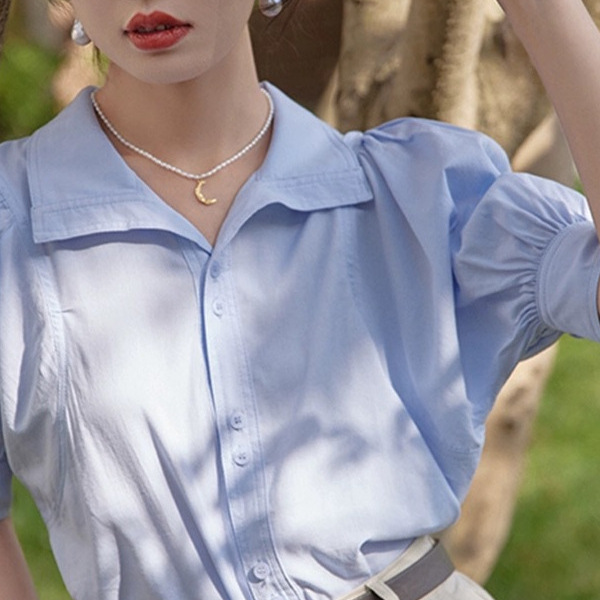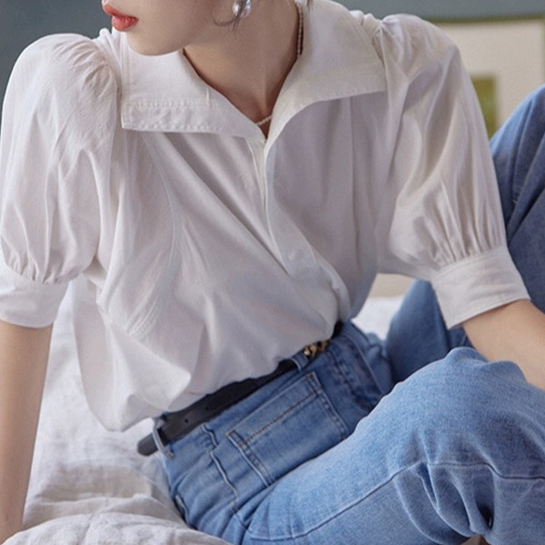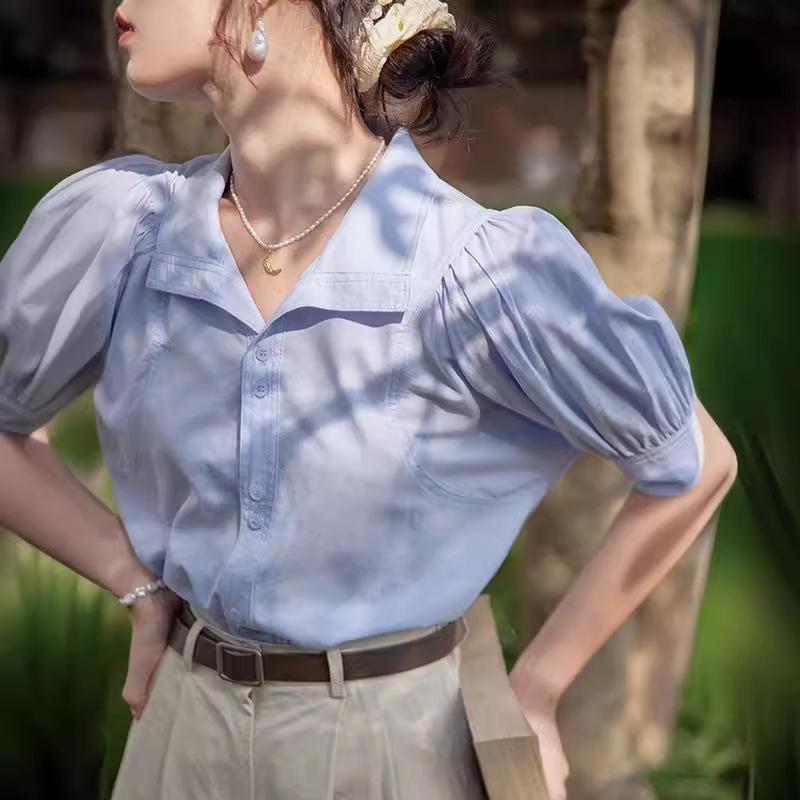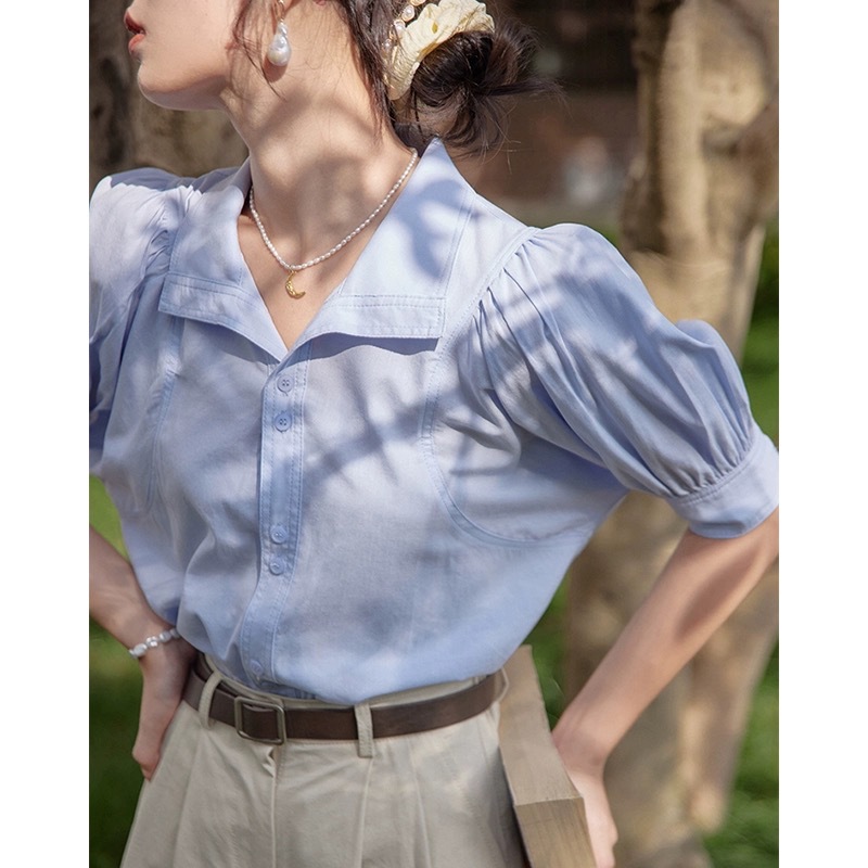 夏季法式气质泡泡袖雪纺衬衣女复古短袖衬衫设计感小众别致上衣薄