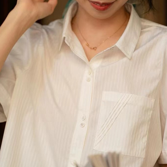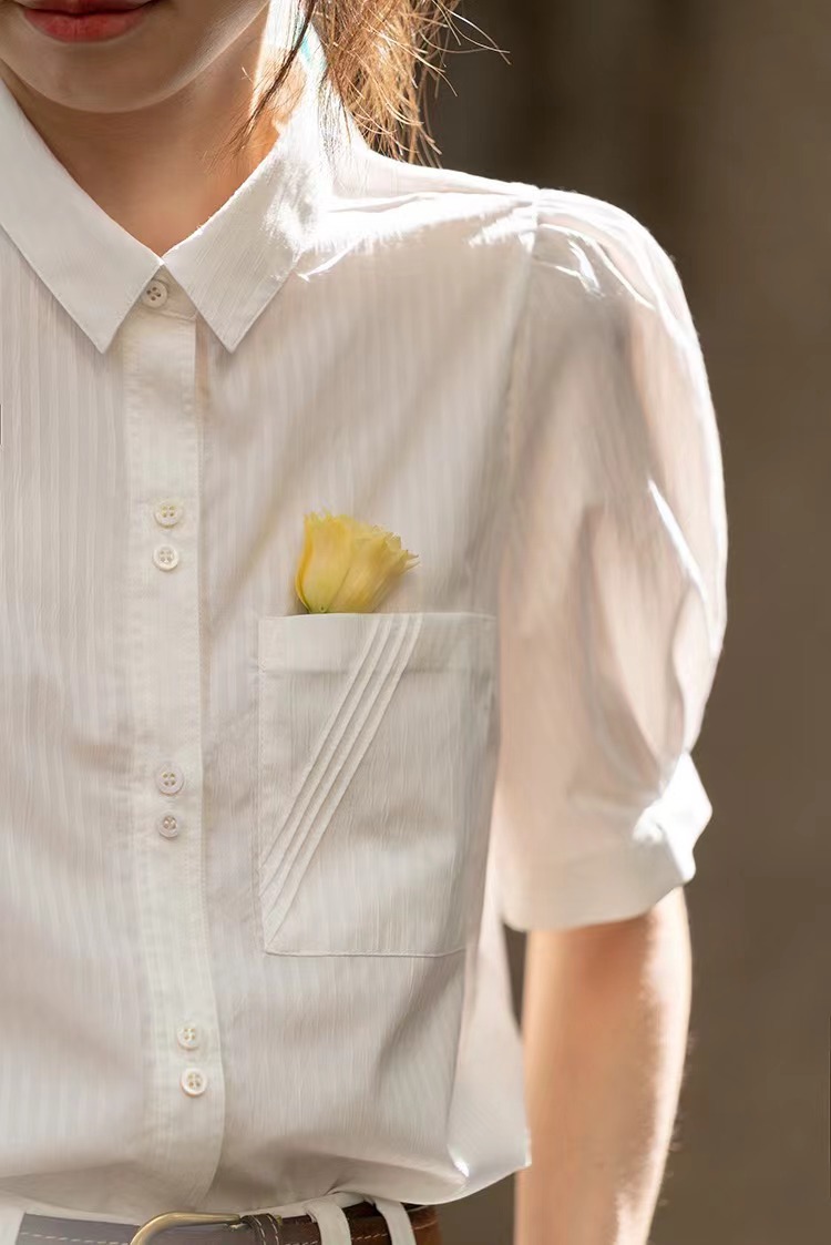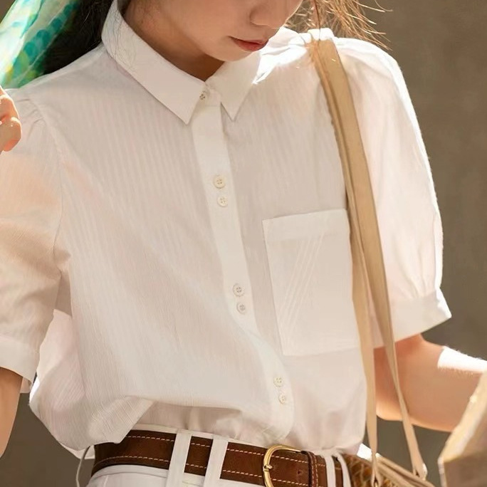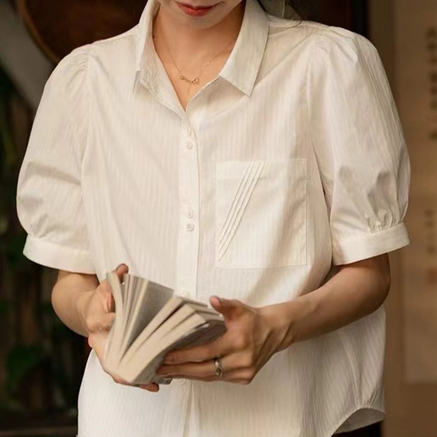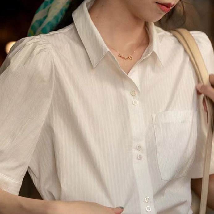 法式气质翻领浮纹白泡泡袖衬衫女夏季设计感小众通勤别致短袖上衣