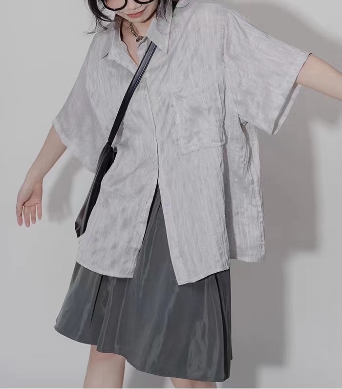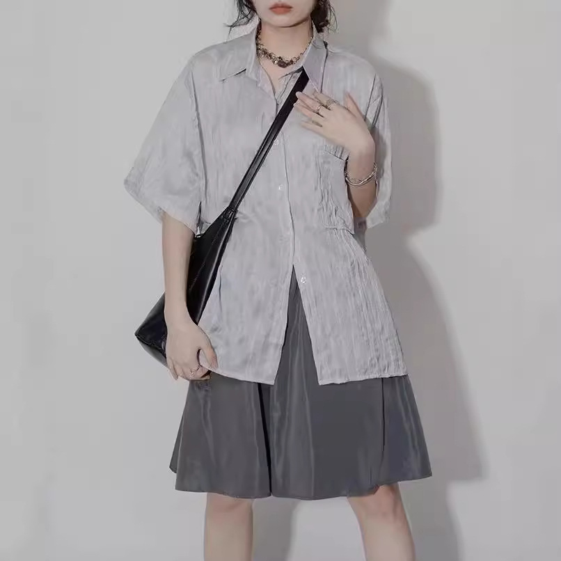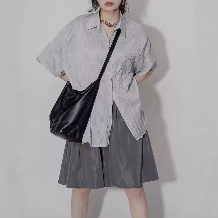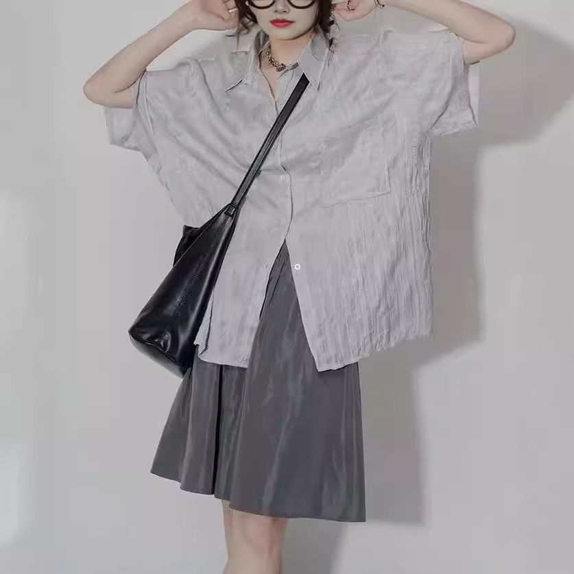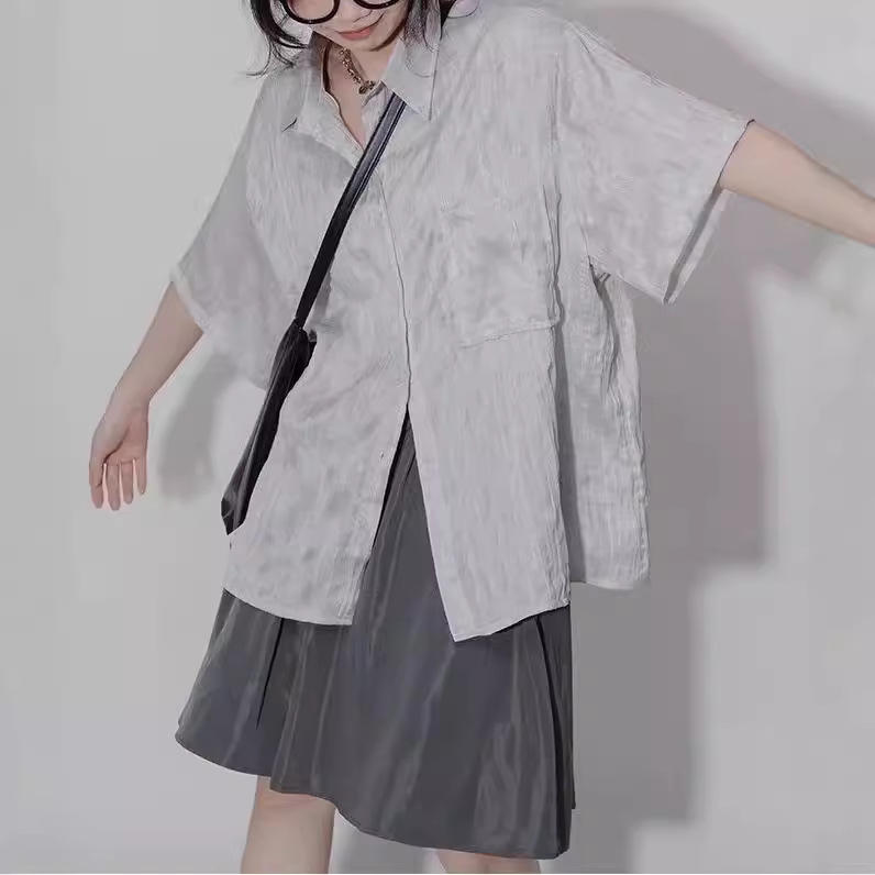 设计感褶皱短袖衬衫女夏季肌理感小众宽松百搭休闲不对称别致衬衣