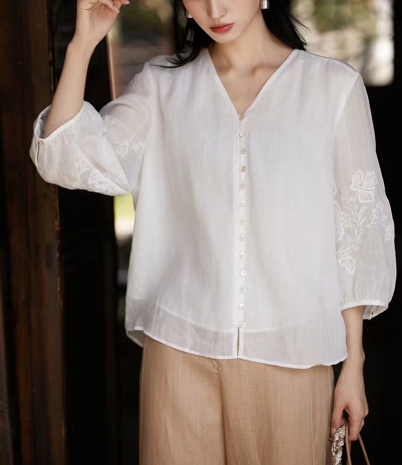 |人间缪斯|灵动飘逸呼吸感苎麻v领刺绣衬衫廓形衬衫小上衣女