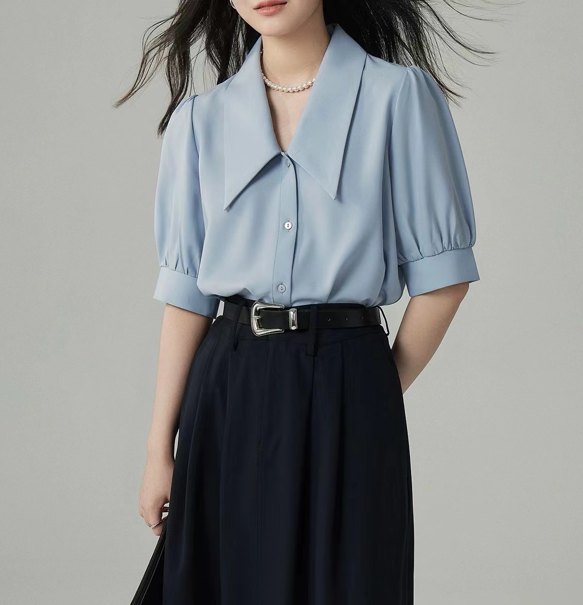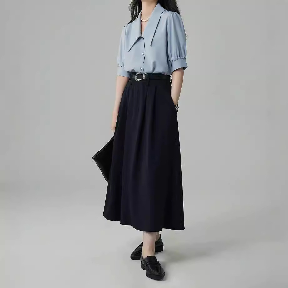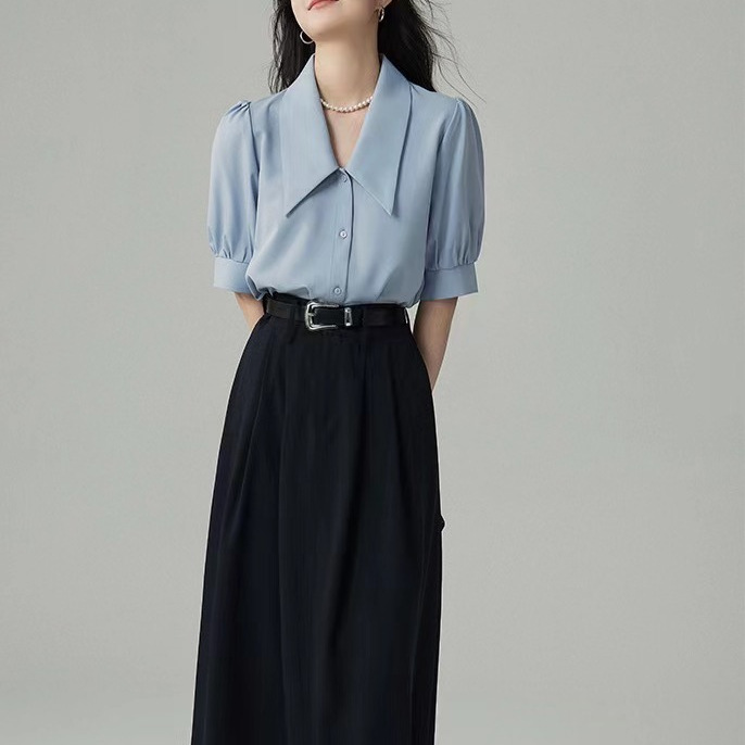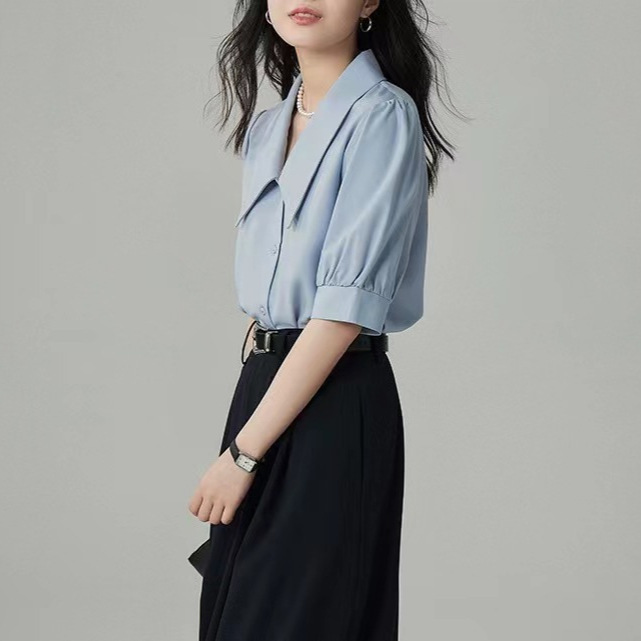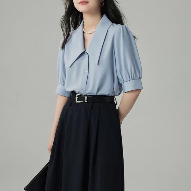 蓝色衬衫女年夏季设计感小众衬衣法式休闲气质尖领泡泡袖上衣