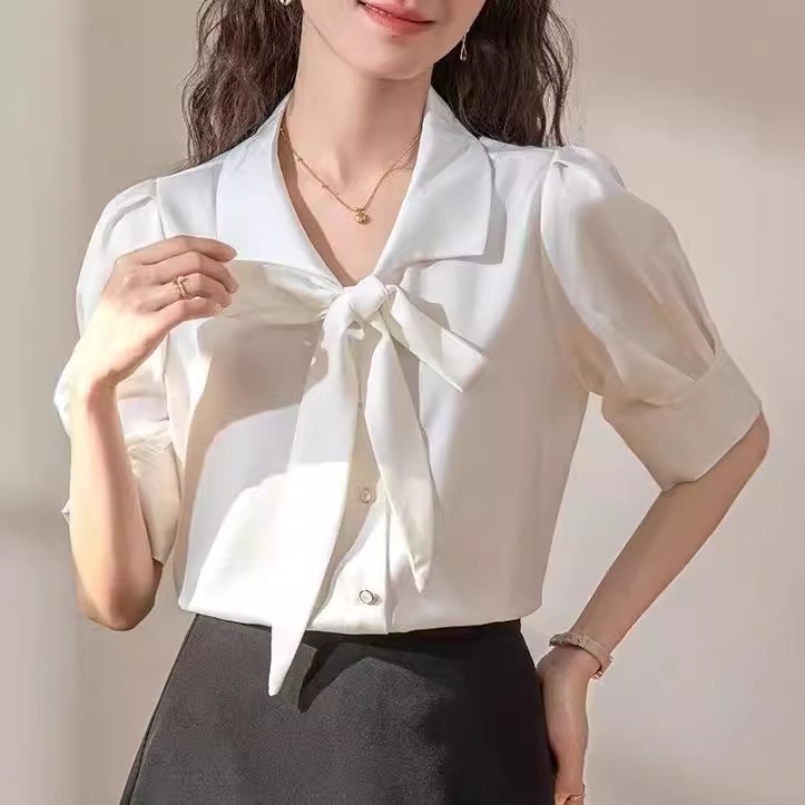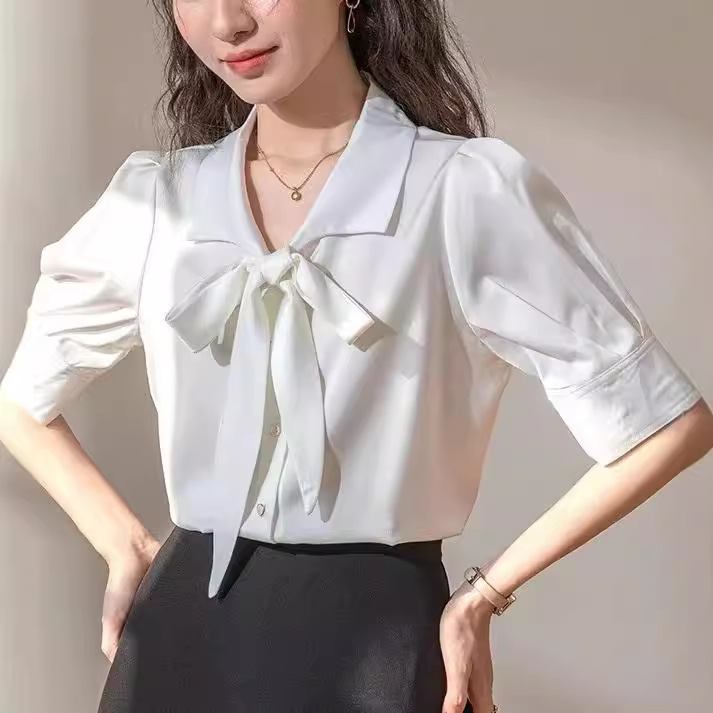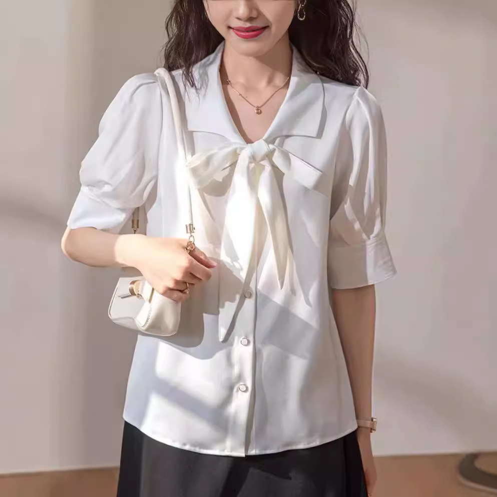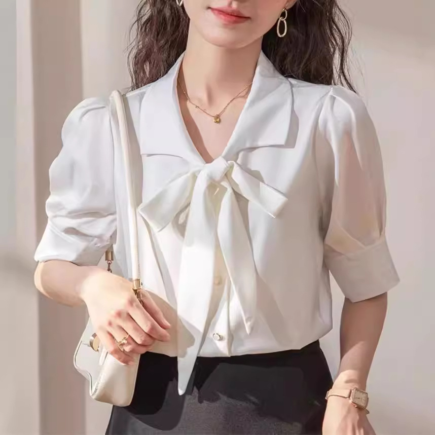 法式蝴蝶结蓝色衬衫女短袖泡泡袖年夏季新款通勤职业面试上衣