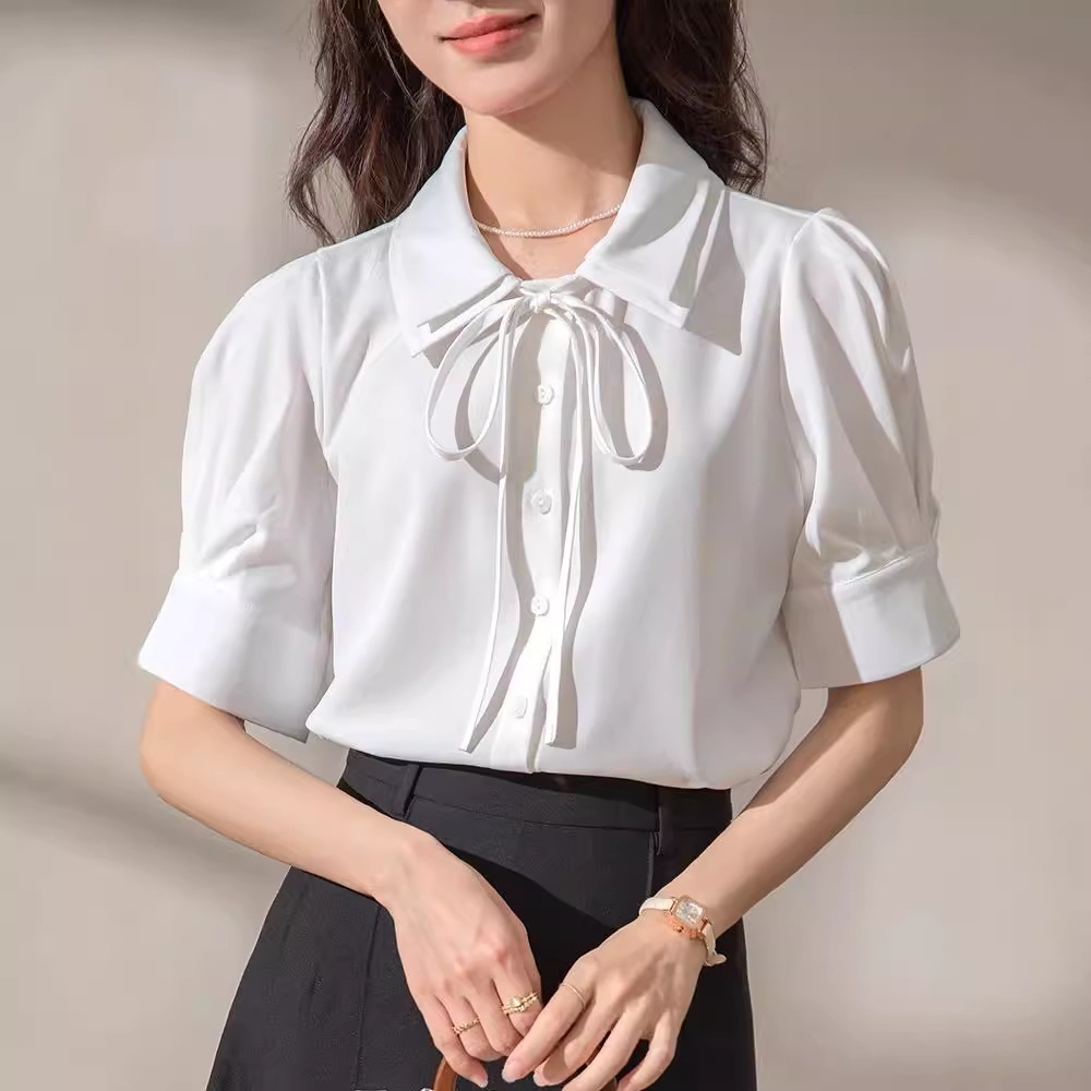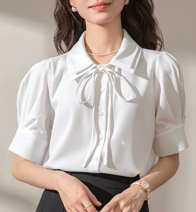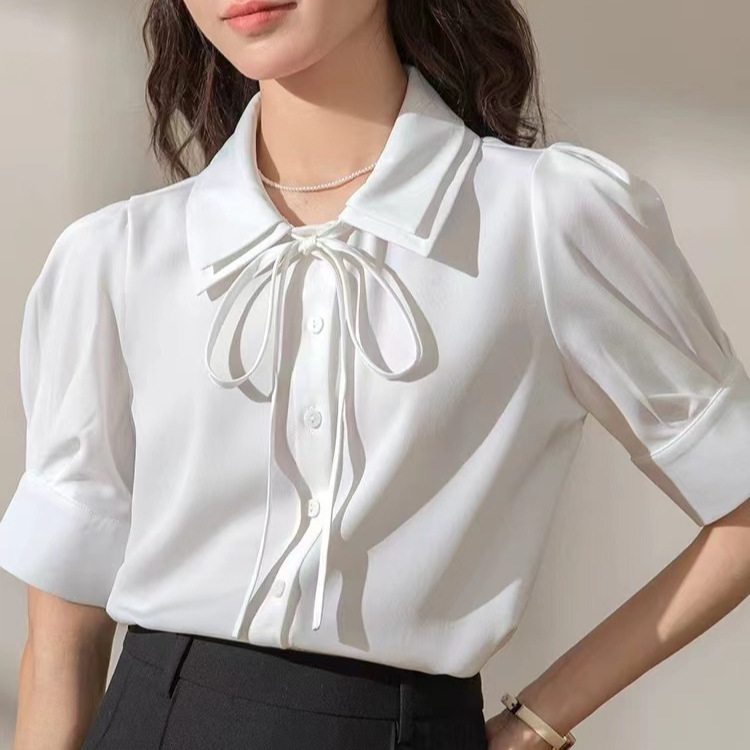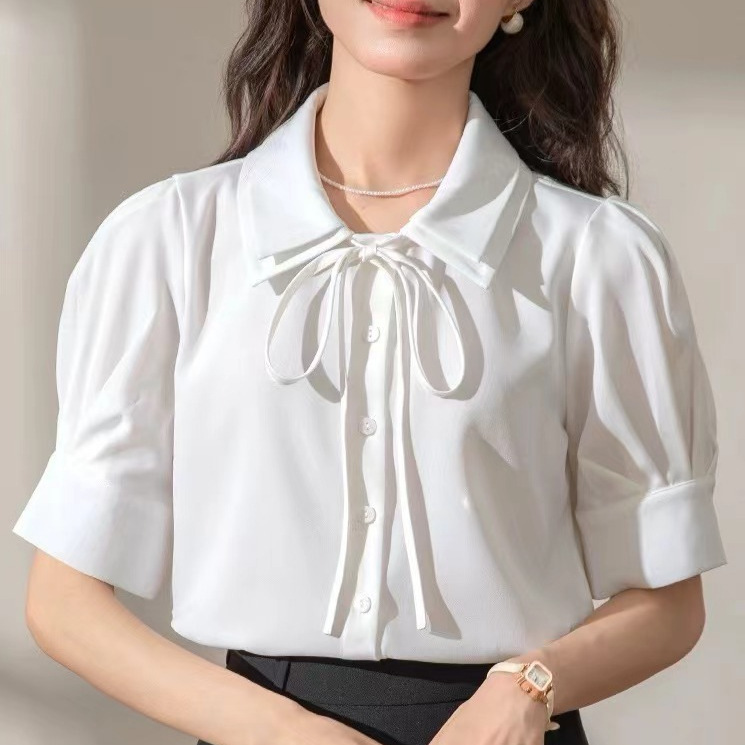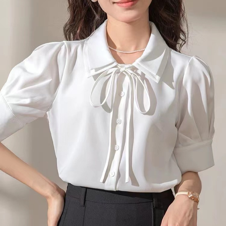 法式短袖白色衬衫女泡泡袖夏季新款通勤职业面试正装雪纺上衣
