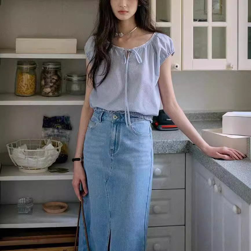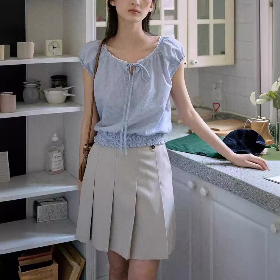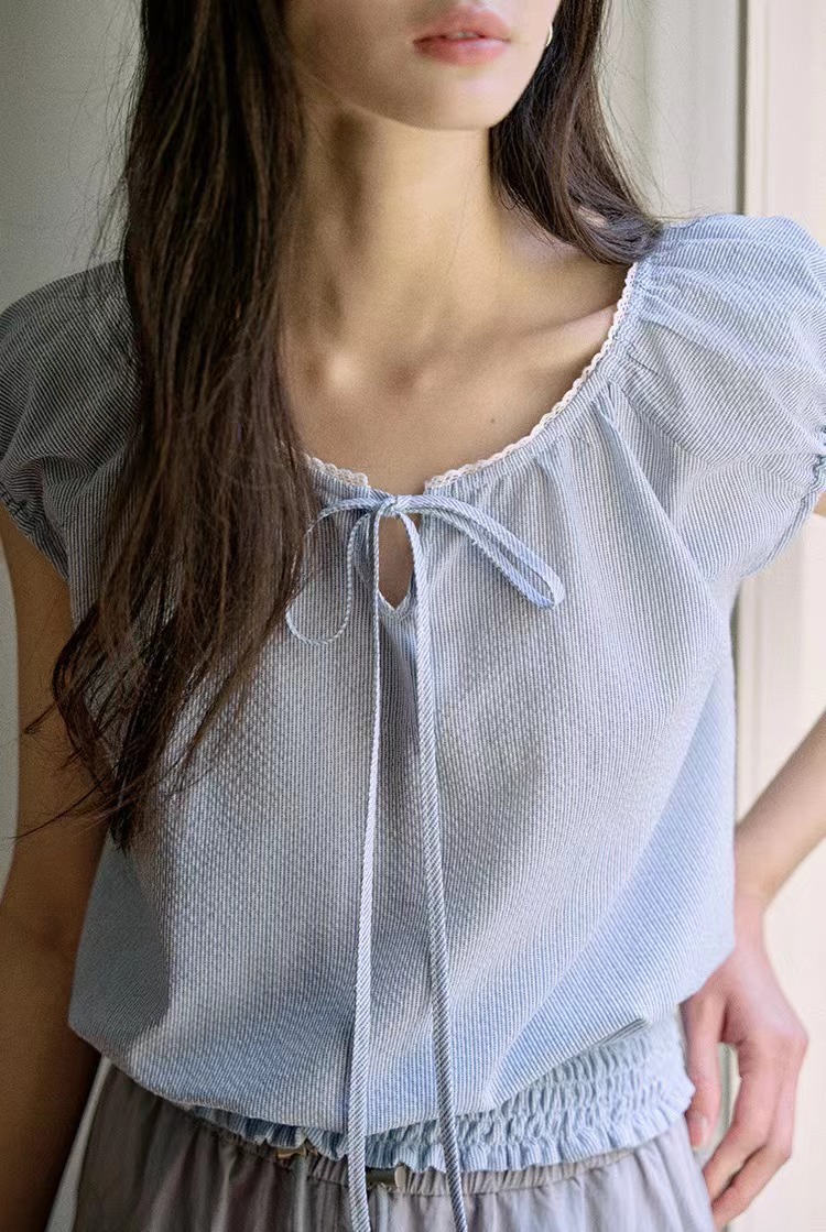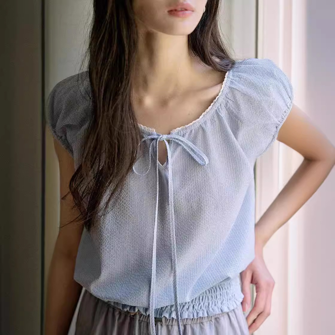“夏花”色织纯棉花边小衫女夏季法式短款抽绳衬衫T恤