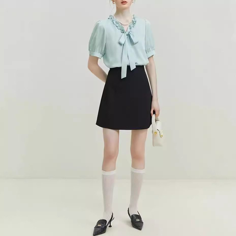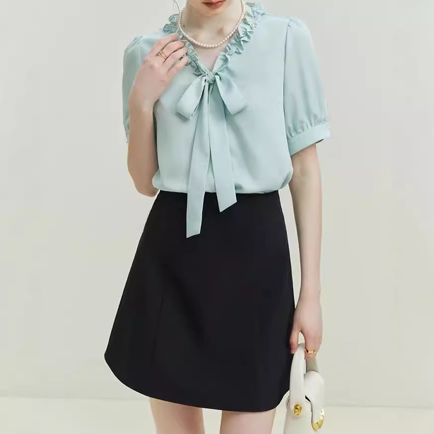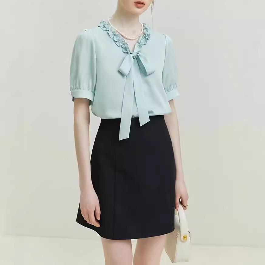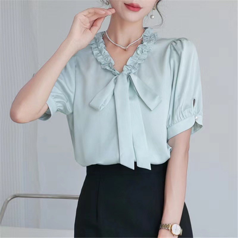 清新浪漫法式木耳边蝴蝶结衬衫夏季甜美优雅短袖女衬衣