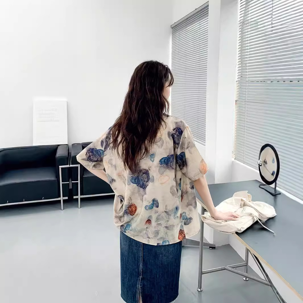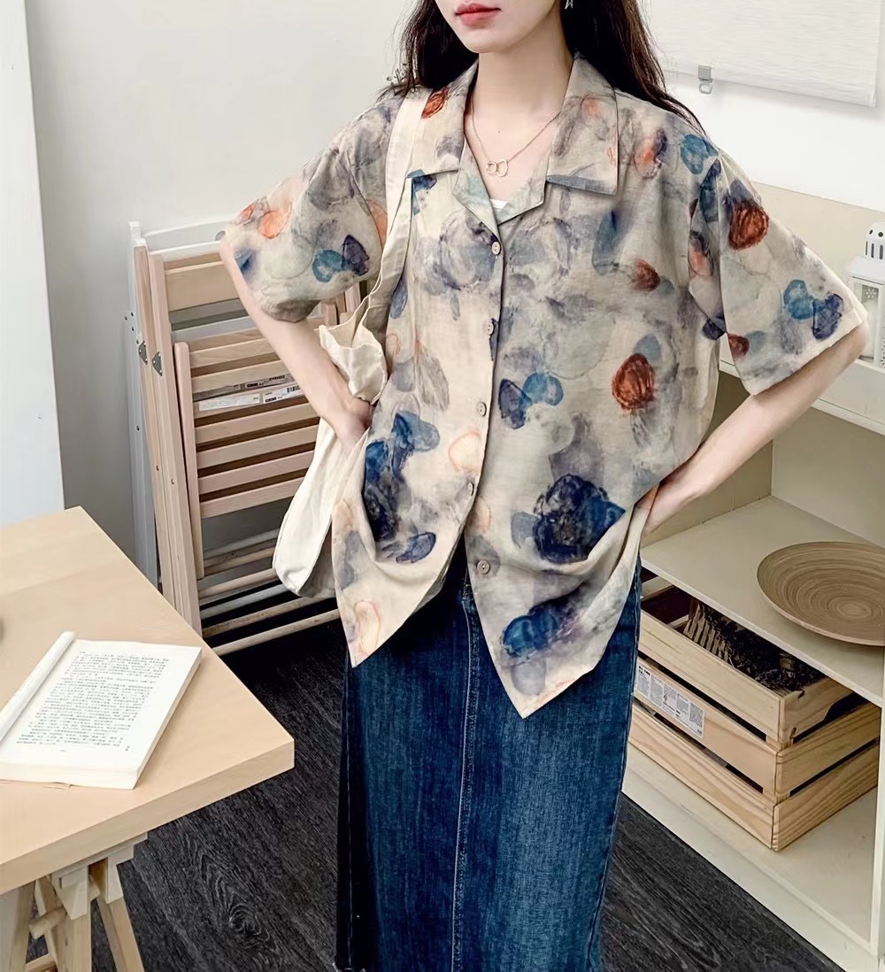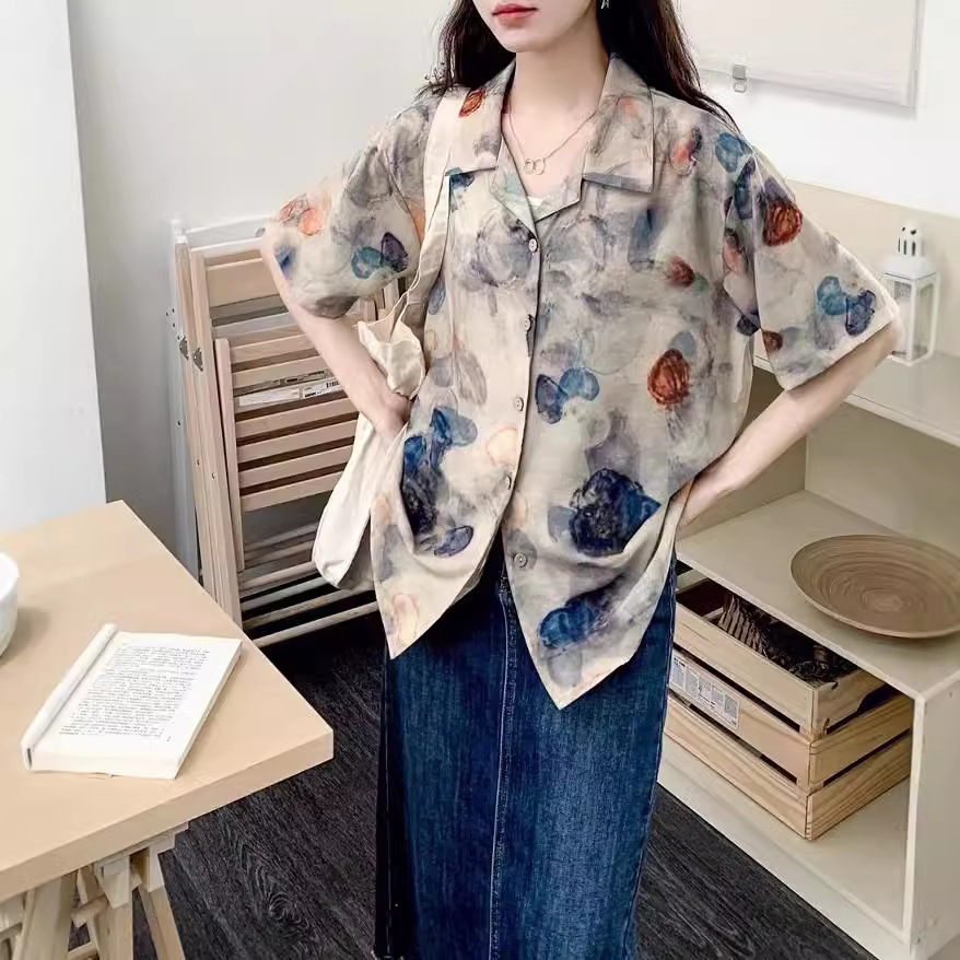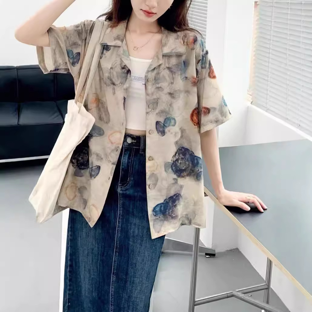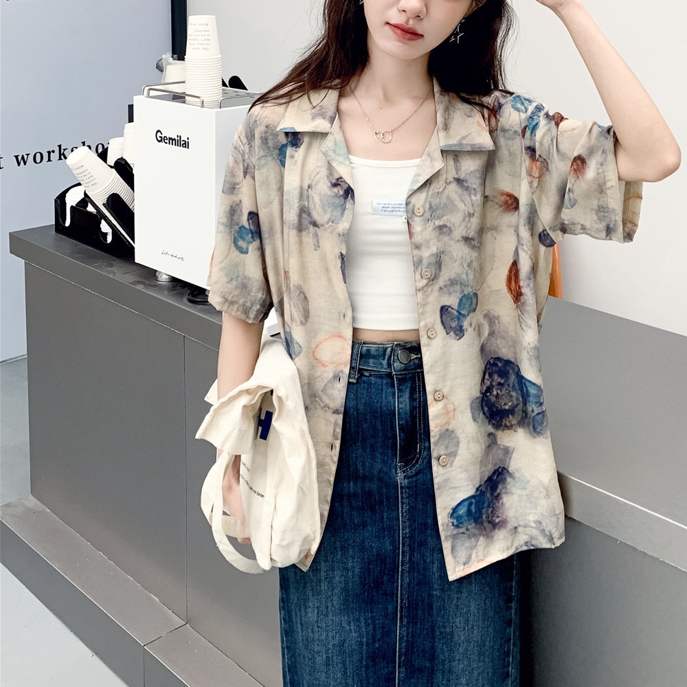 港味复古印花衬衫女夏新款宽松度假风短袖青春少年感衬衣上衣