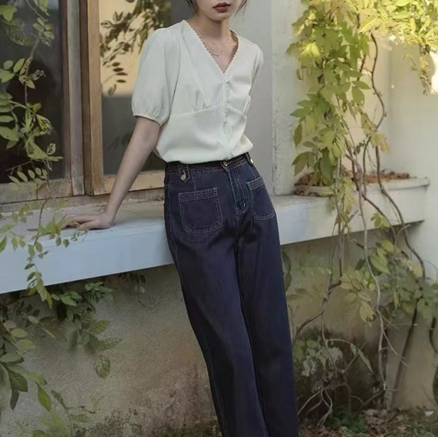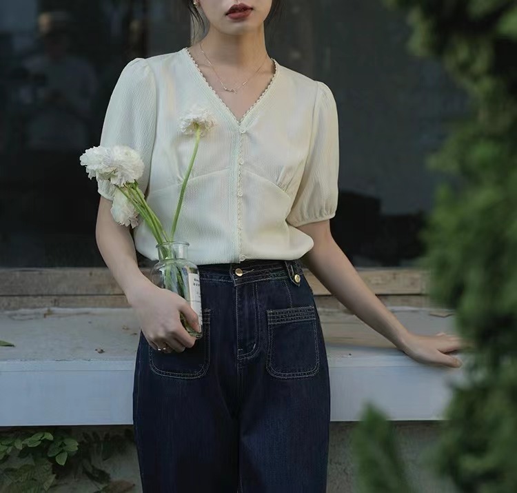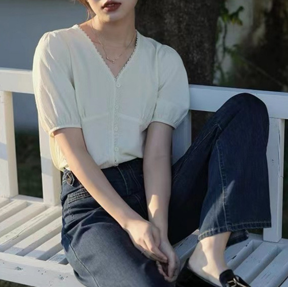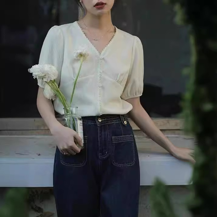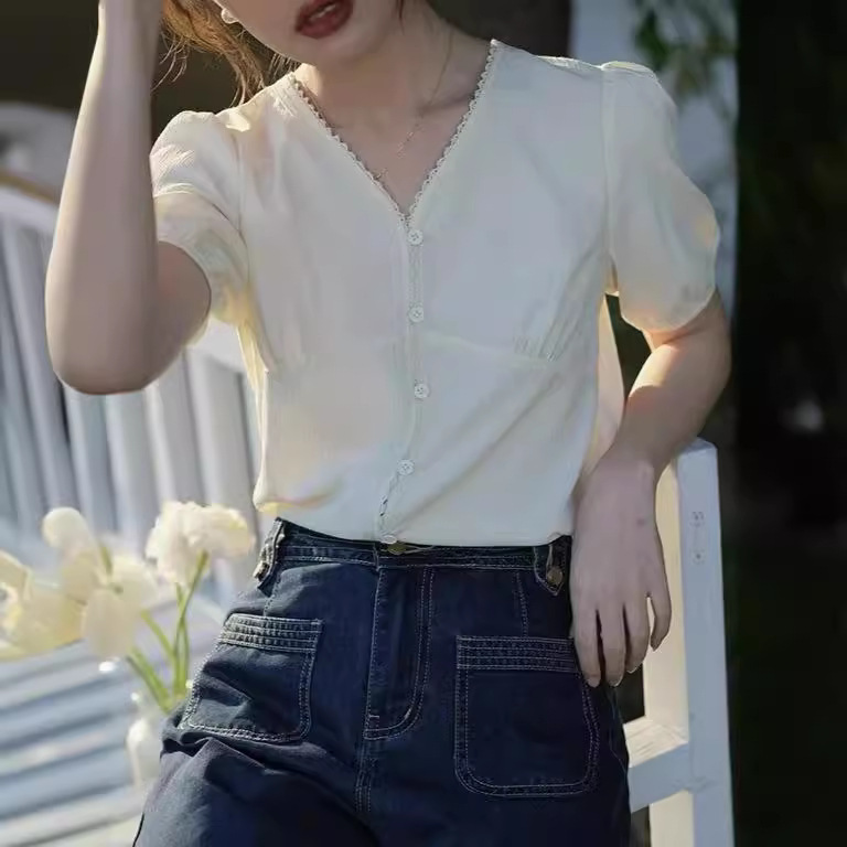 法式杏色短袖衬衫女夏季泡泡袖娃娃衫设计感小众衬衣v领正肩上衣