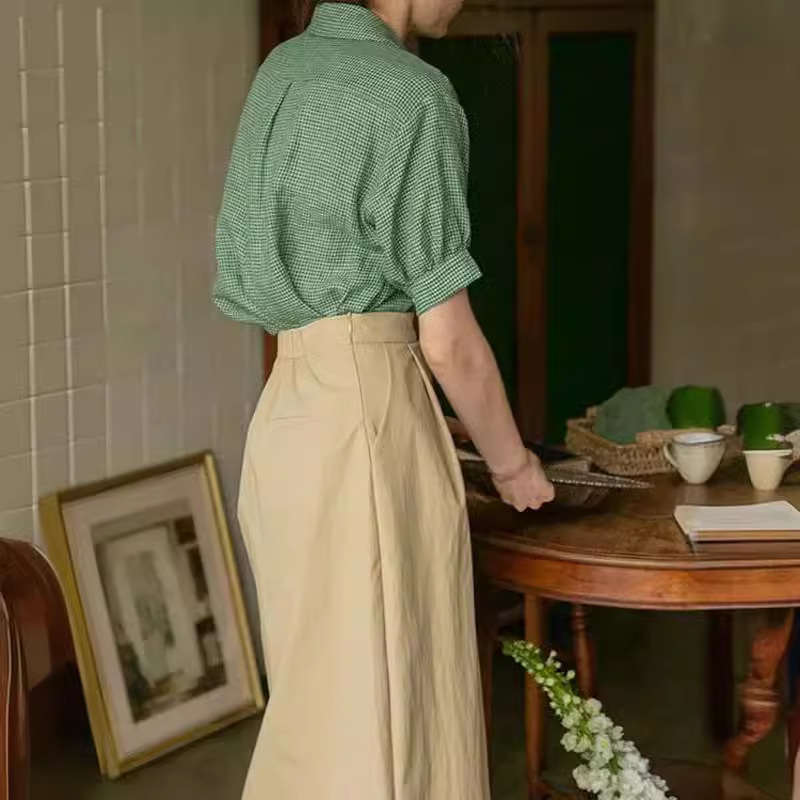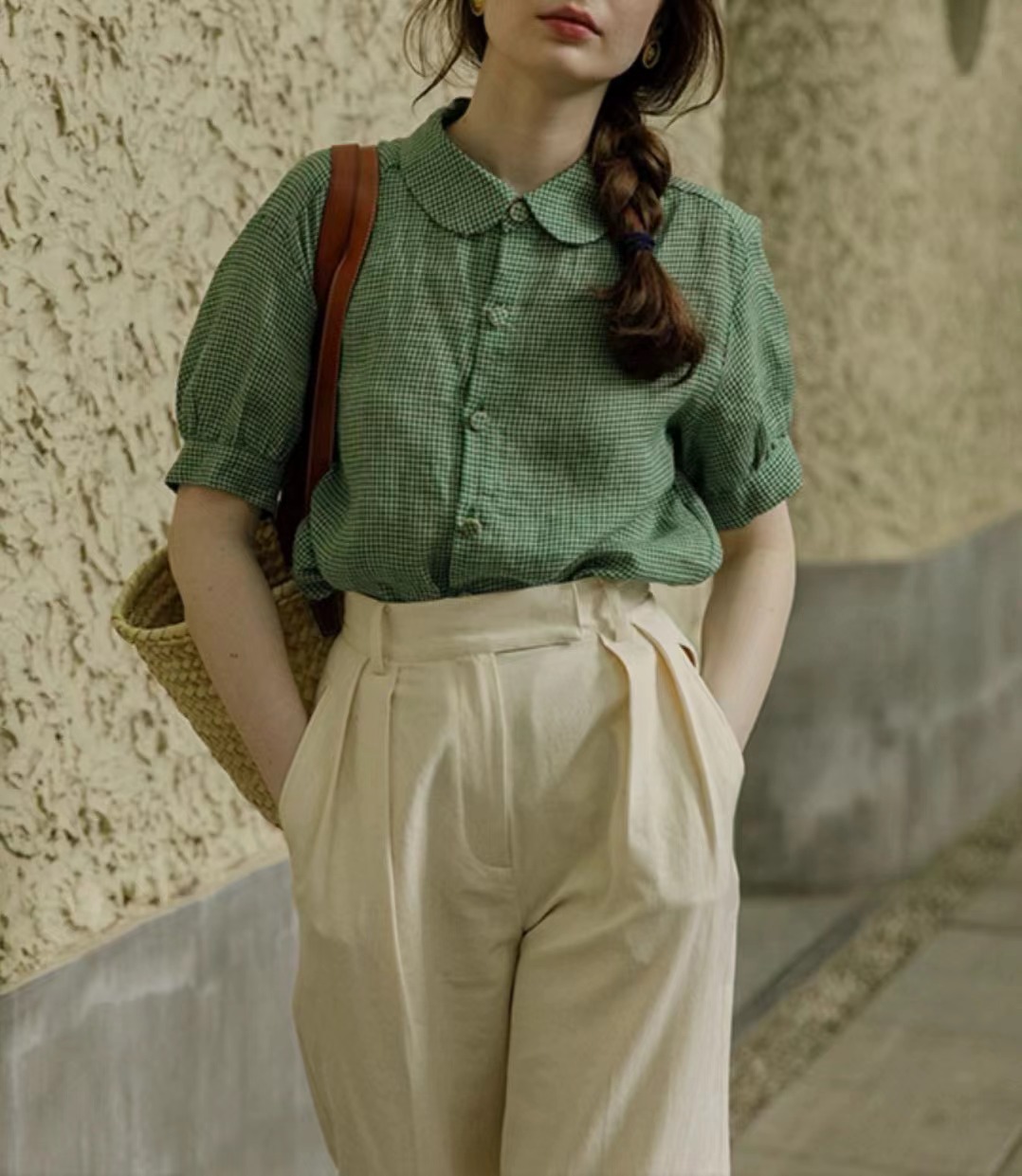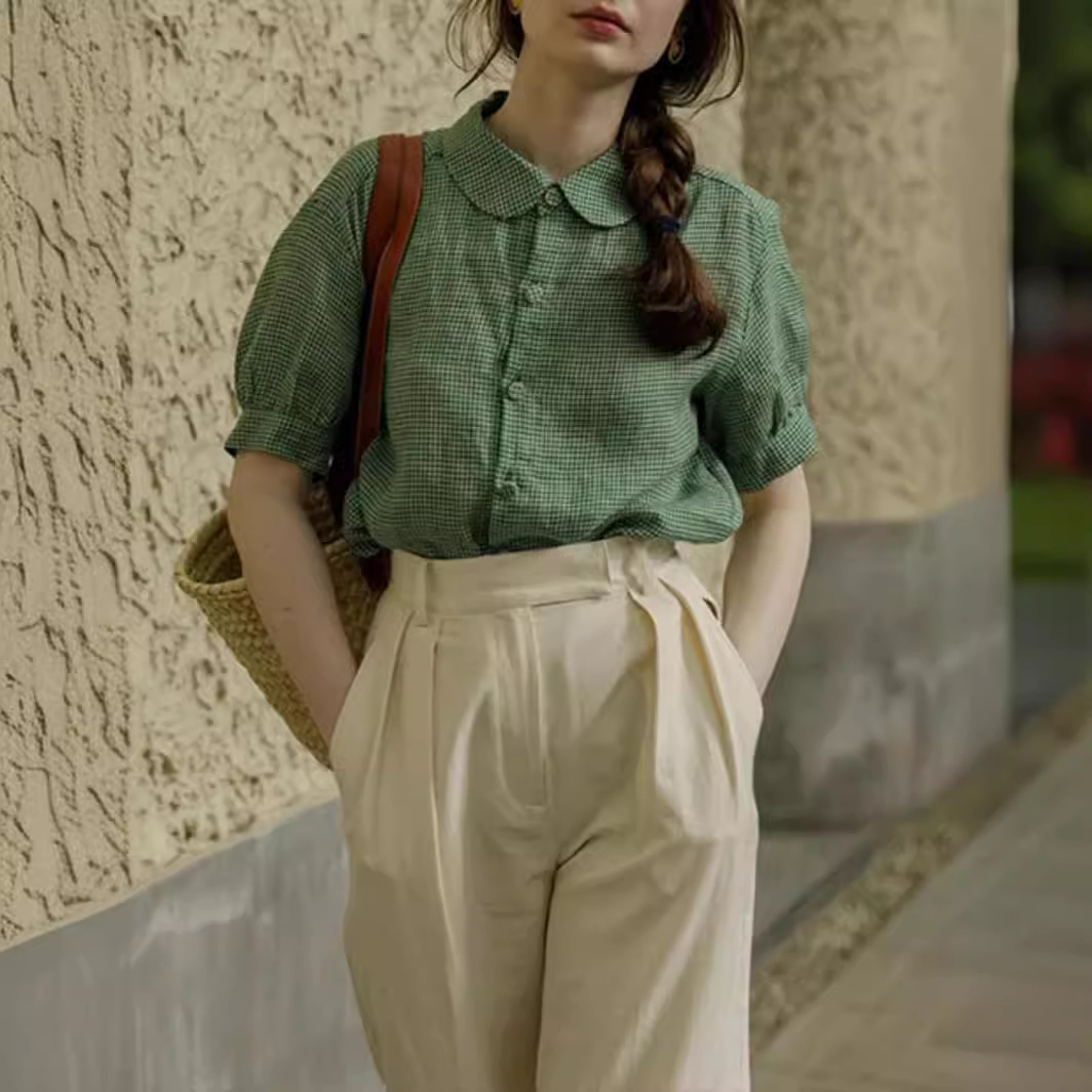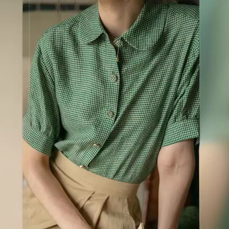 法式复古娃娃领上衣格子刺绣宽松气质纯亚麻短袖衬衫女夏
