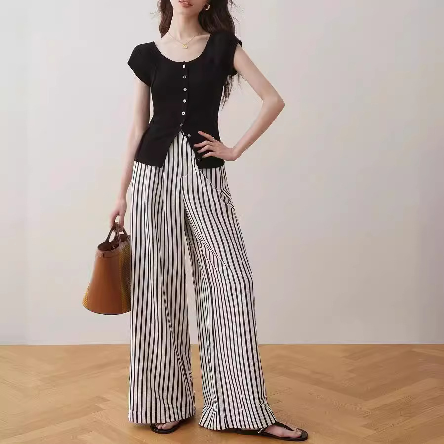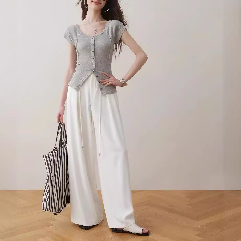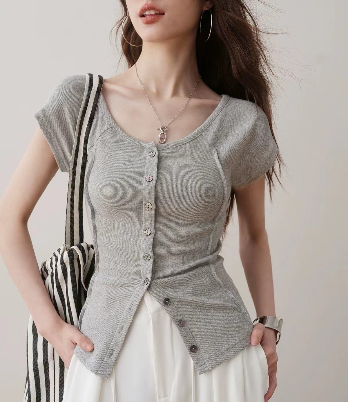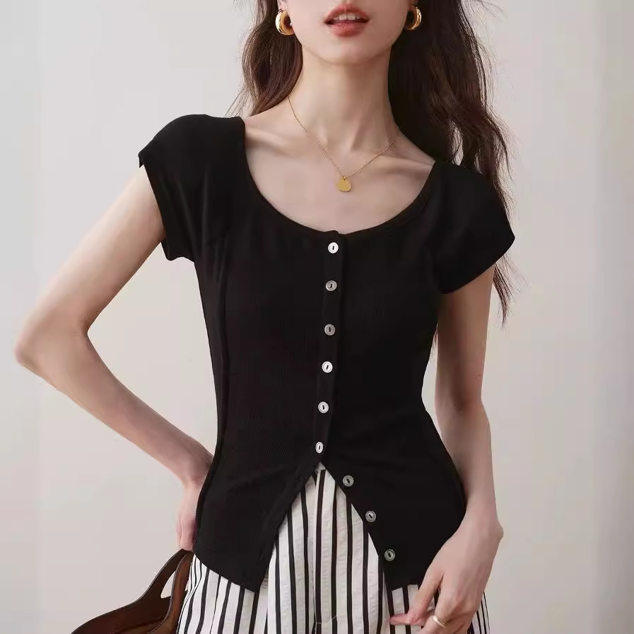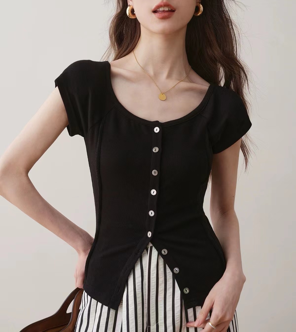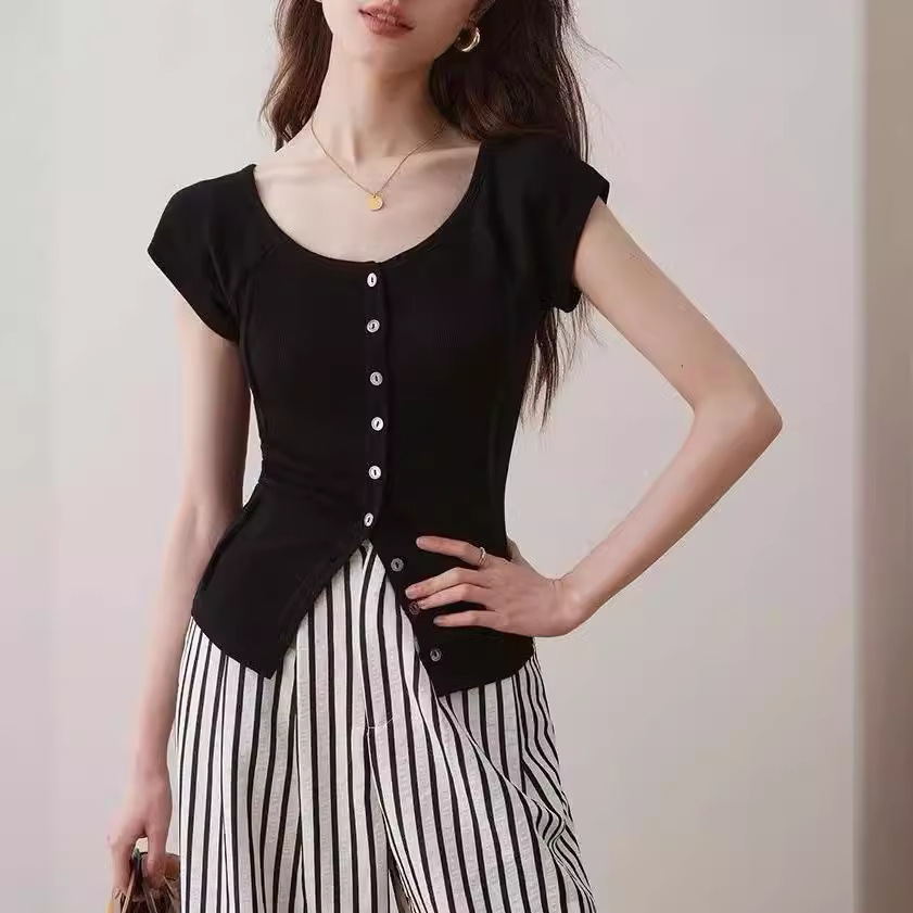 简约修身排扣短袖T恤夏季新款显瘦低圆领薄款冰丝针织上衣