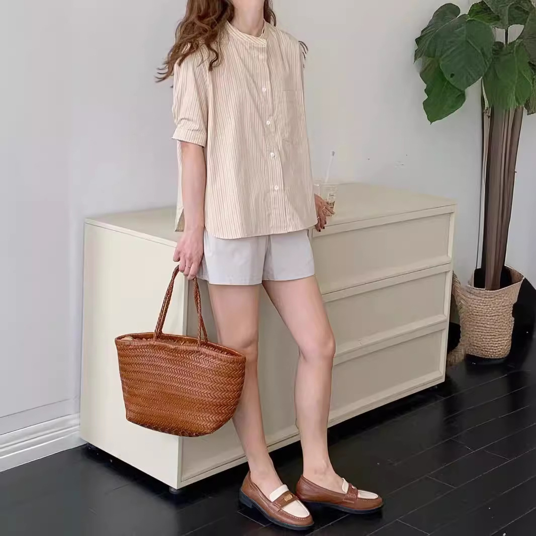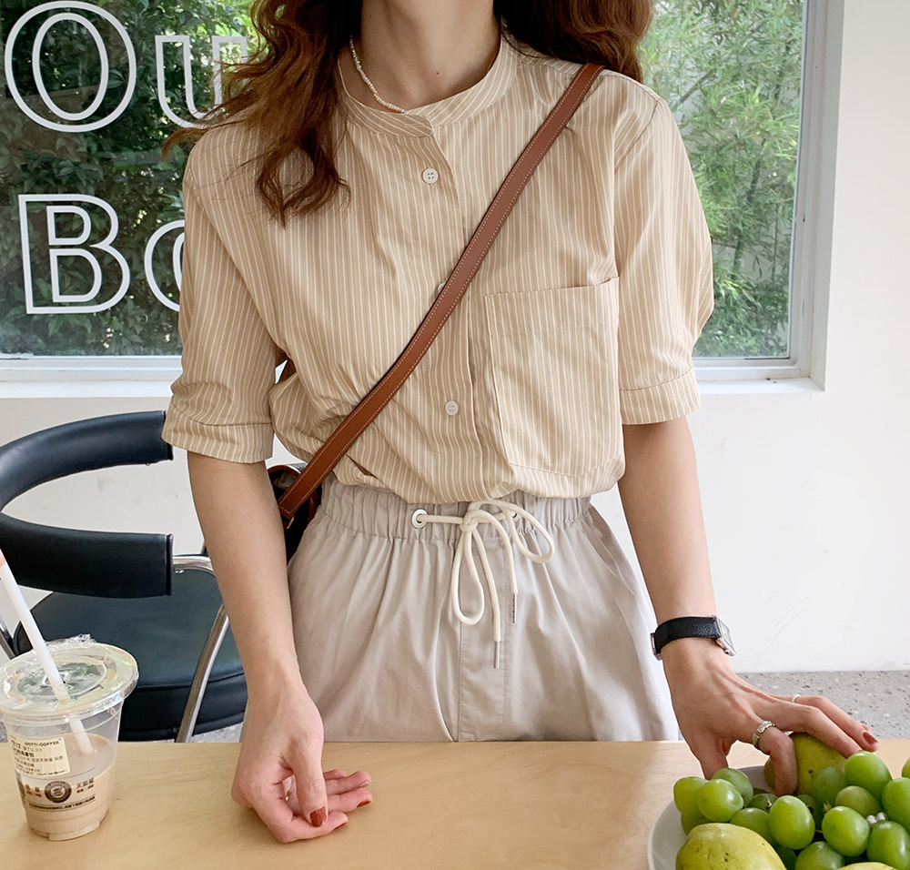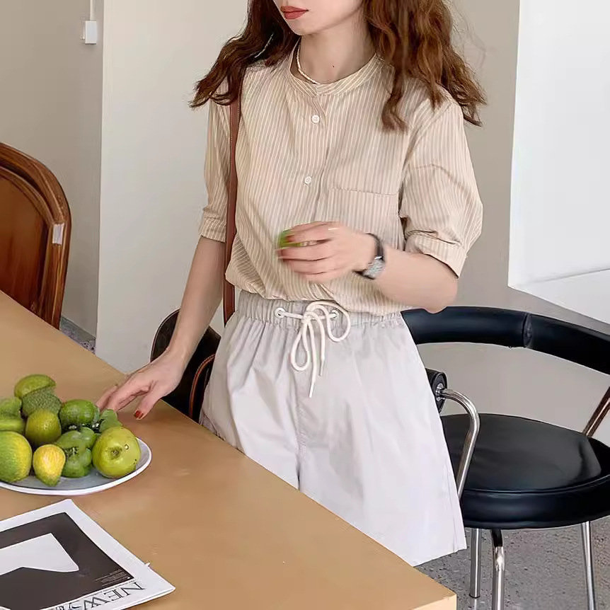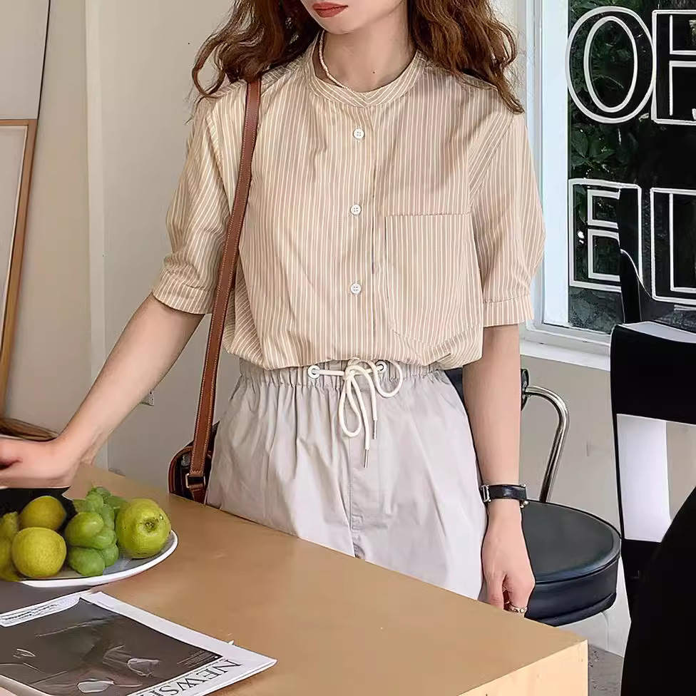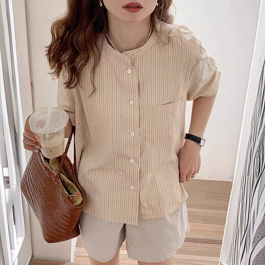 24夏季奶油话梅拿铁法式复古奶咖白条纹立领盐系短袖衬衫