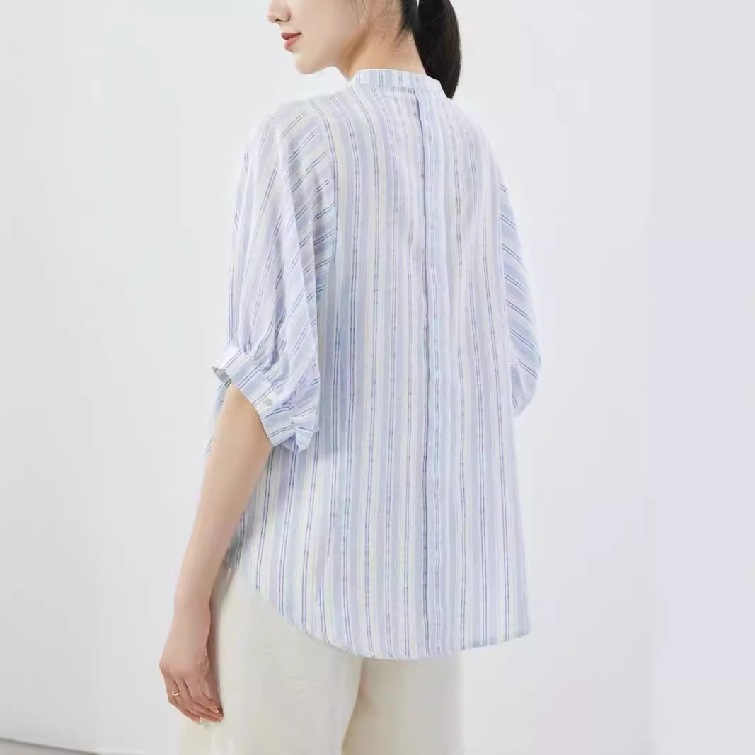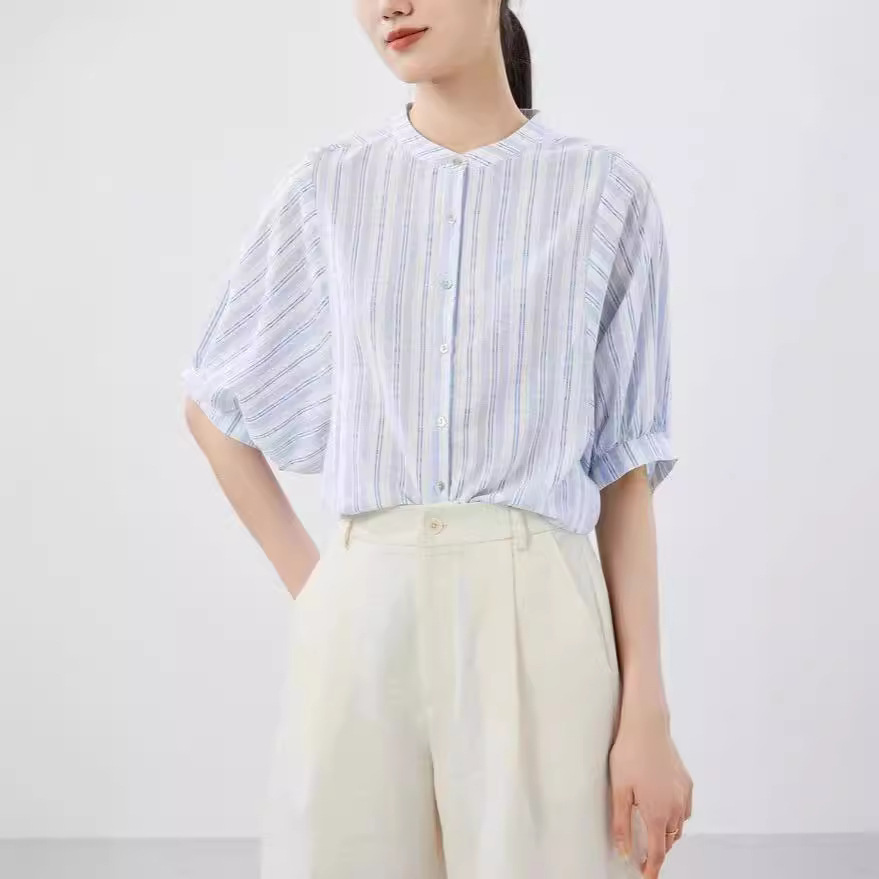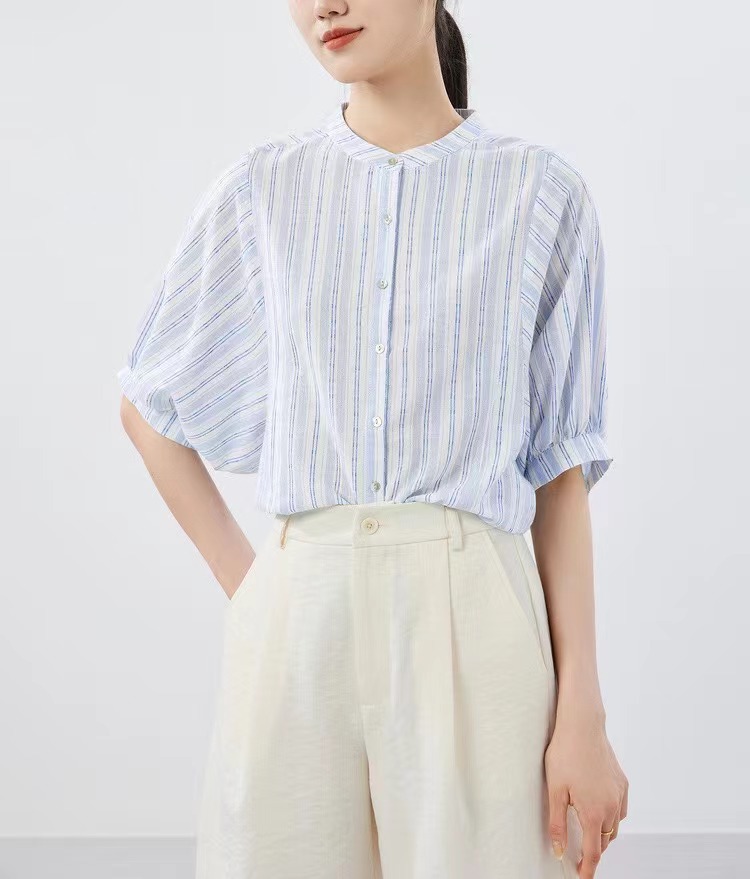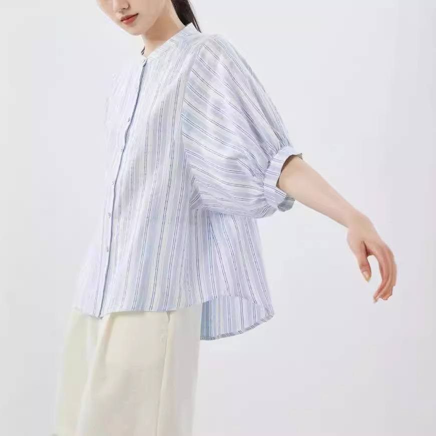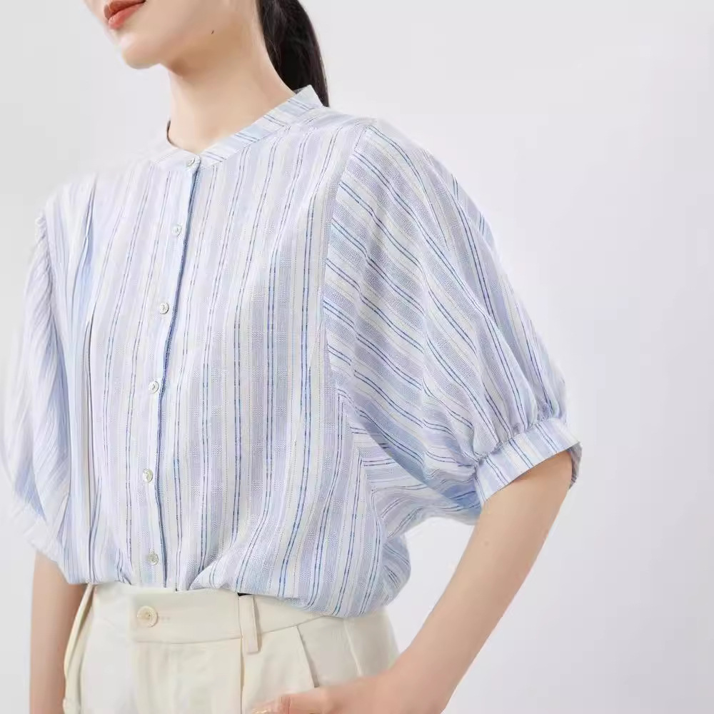 温文尔雅法式条纹清新色织薄棉蝙蝠袖衬衫女