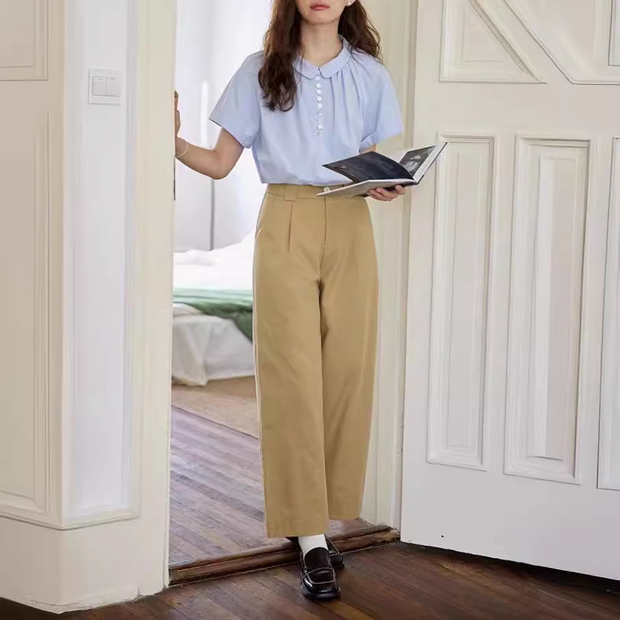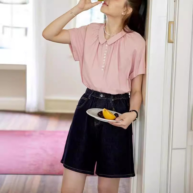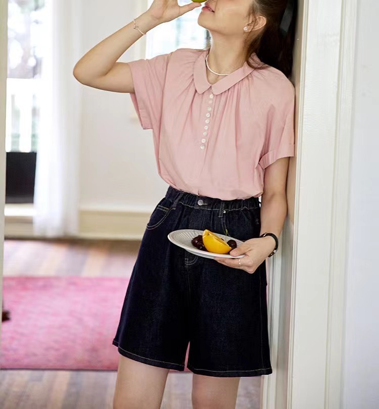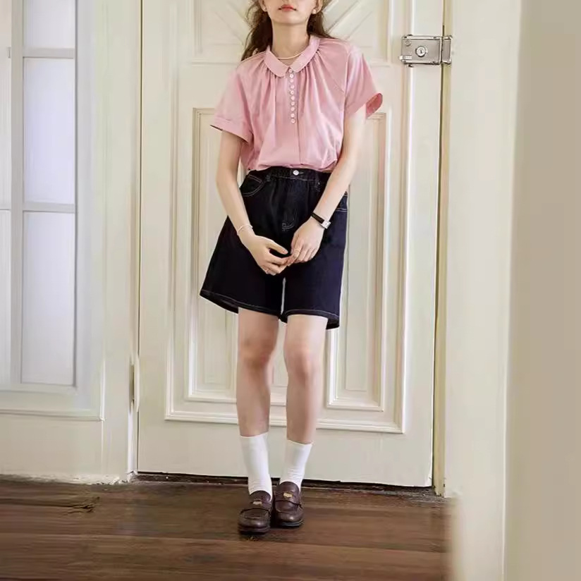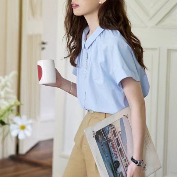 法式复古娃娃领贝壳扣设计感衬衫夏季显瘦短袖女