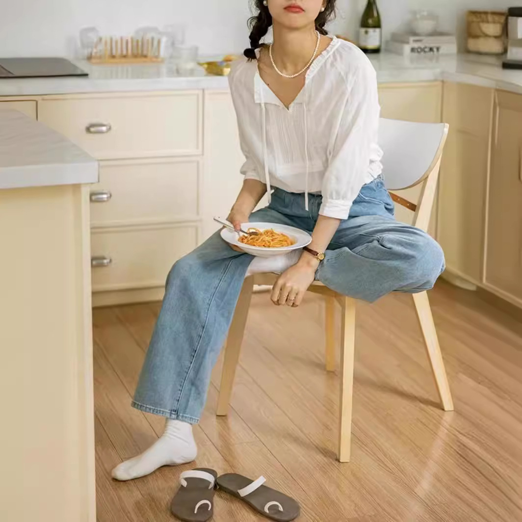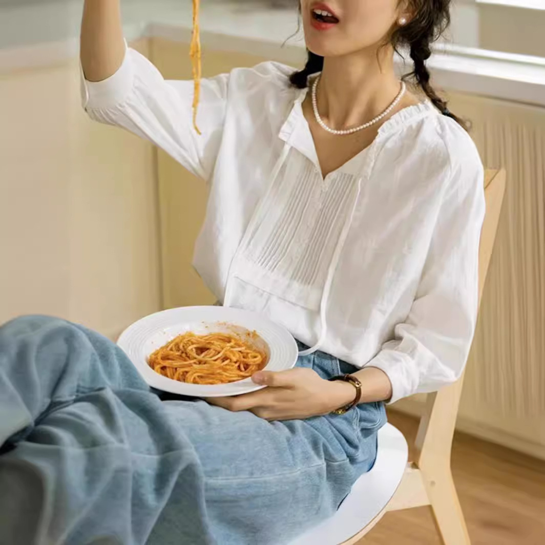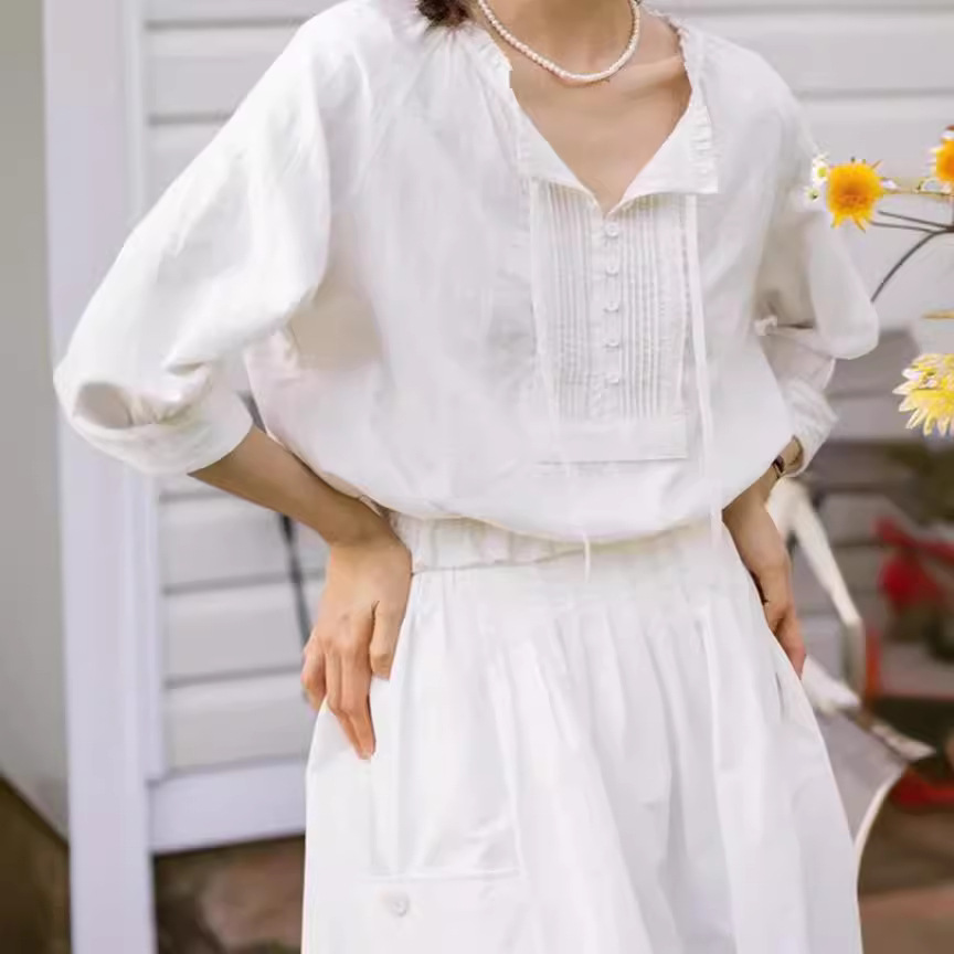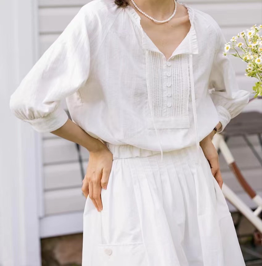 “南法假日”法式复古少女感花边肌理感七分袖纯棉飘带小衫