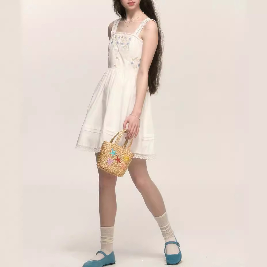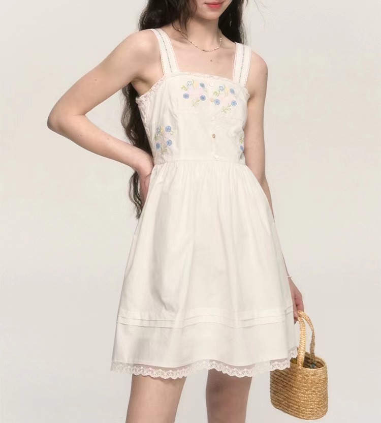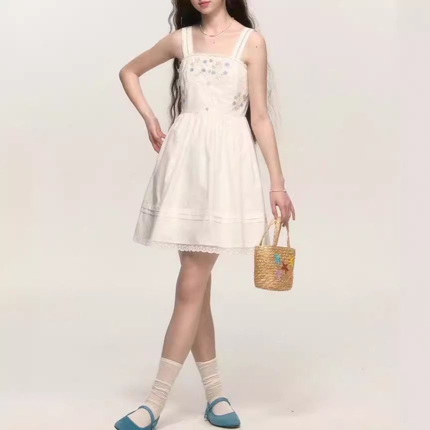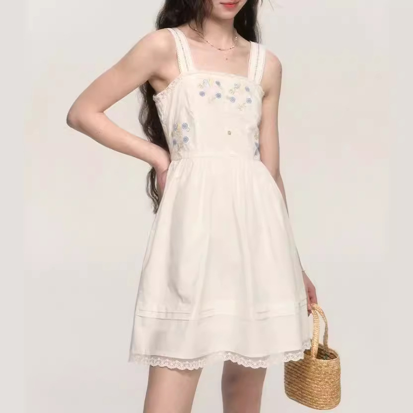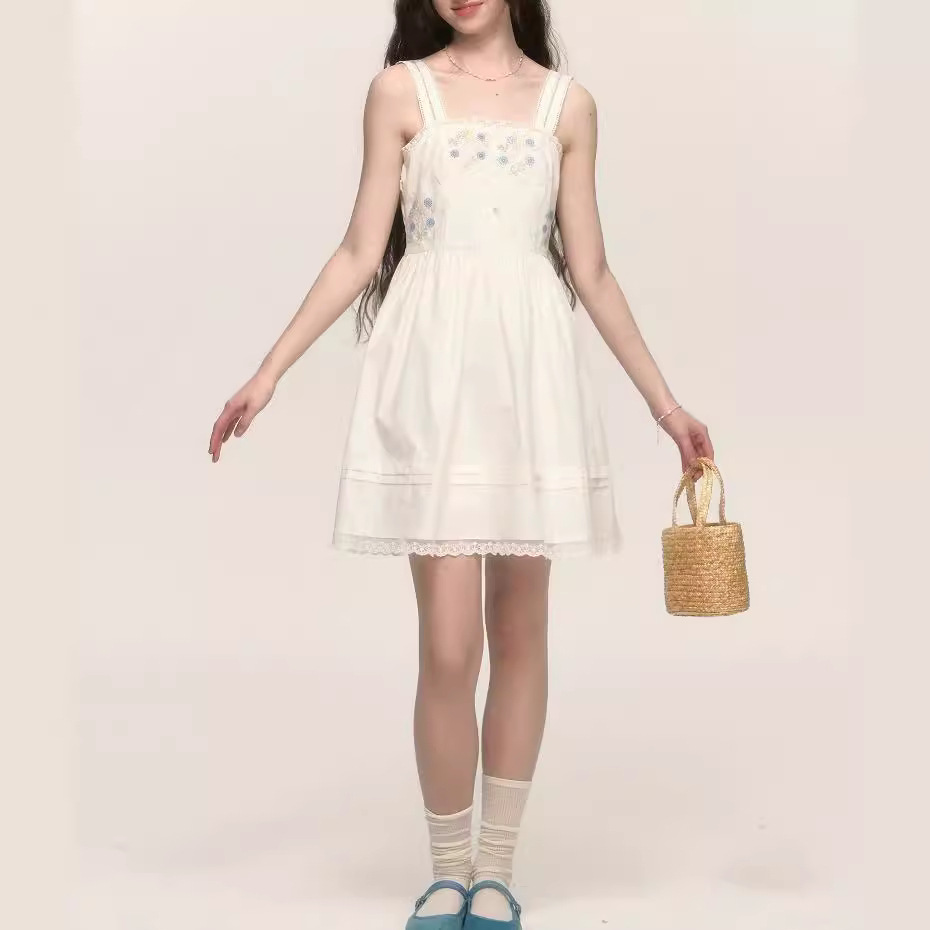 原创法式复古少女感小花刺绣蕾丝花边A字收腰连衣裙