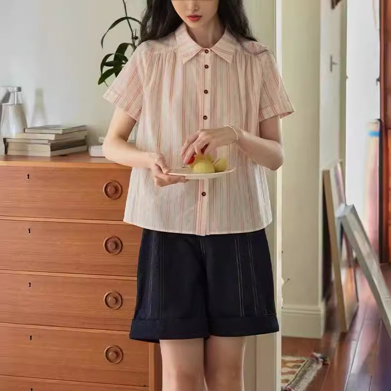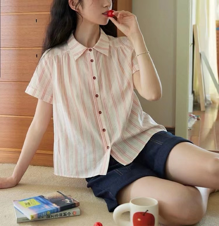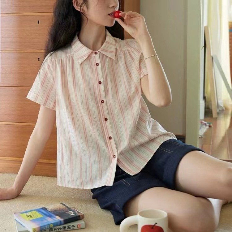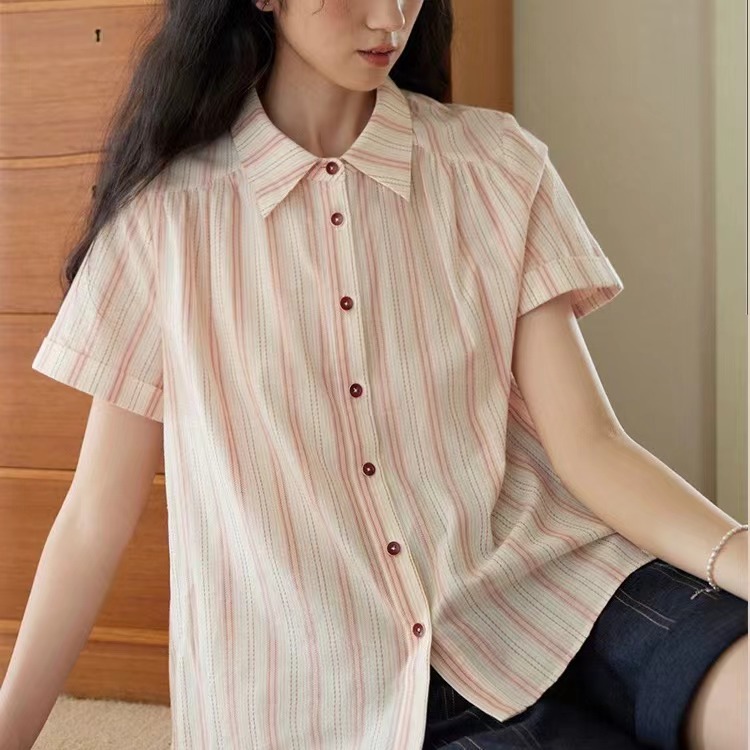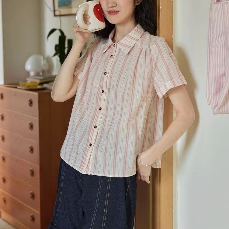 红色竖条纹翻领短袖衬衫女夏季法式复古宽松全棉通勤上衣