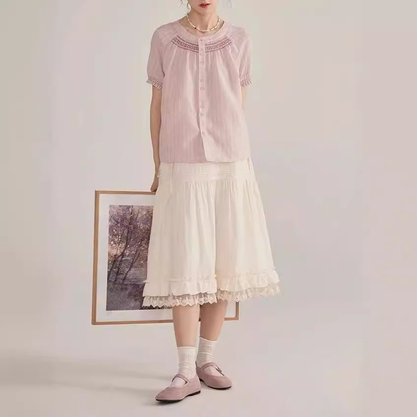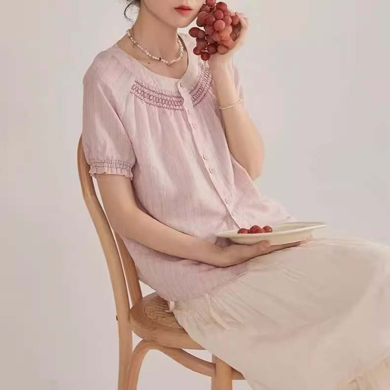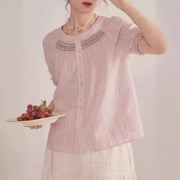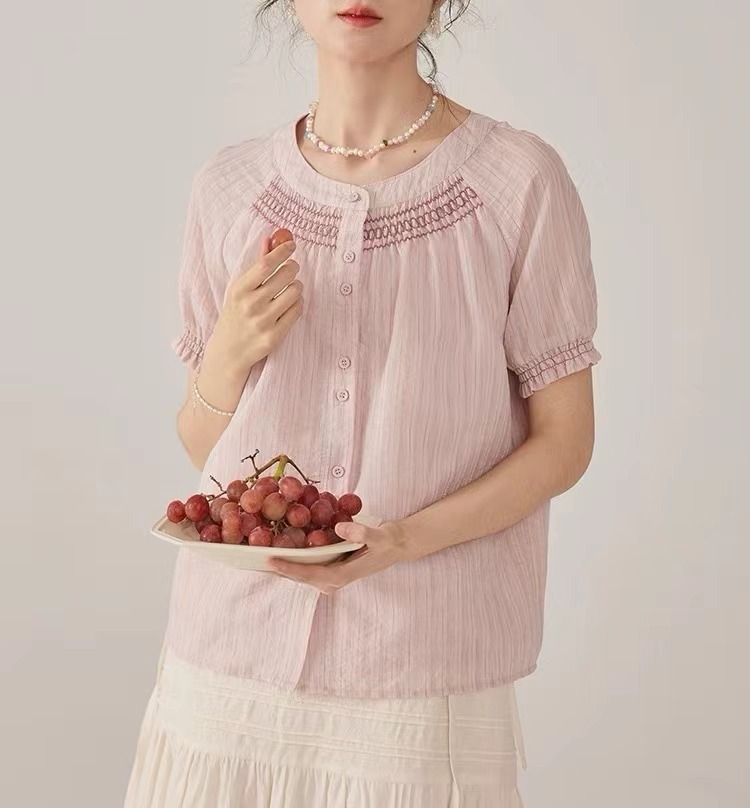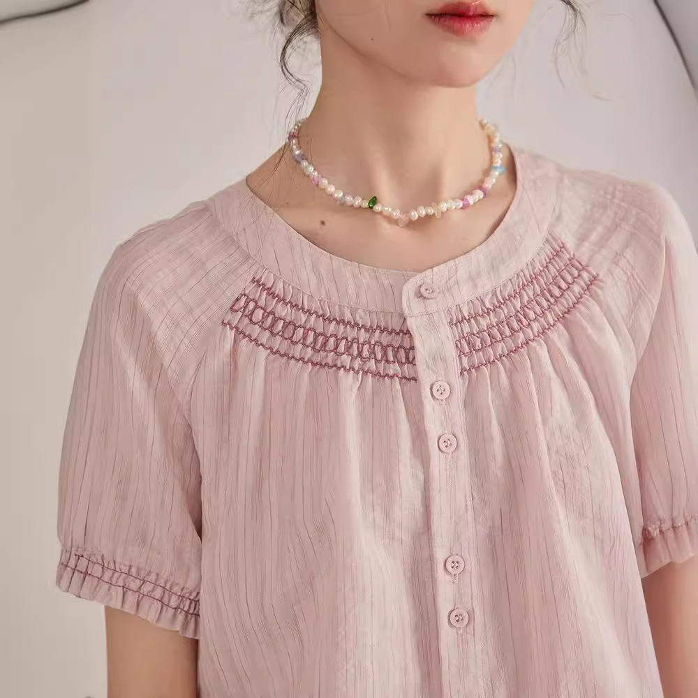 桔粉色甜美减龄压褶衬衫女夏季新款法式复古宽松圆领短袖上衣