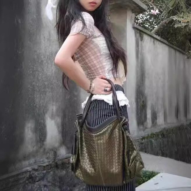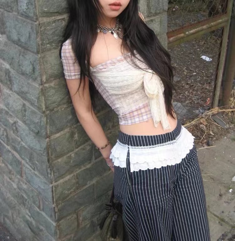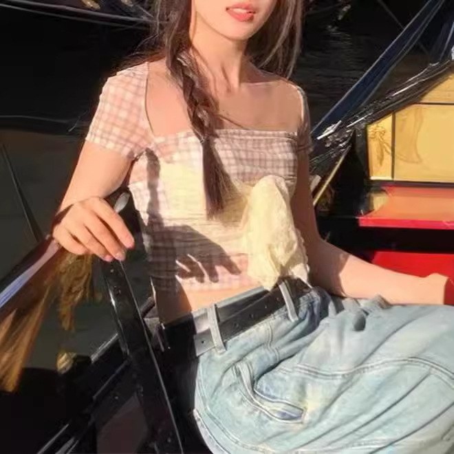 纯欲风黄紫格纹拼接显瘦一字领短上衣女辣妹蕾丝绑带设计挂肩衬衫