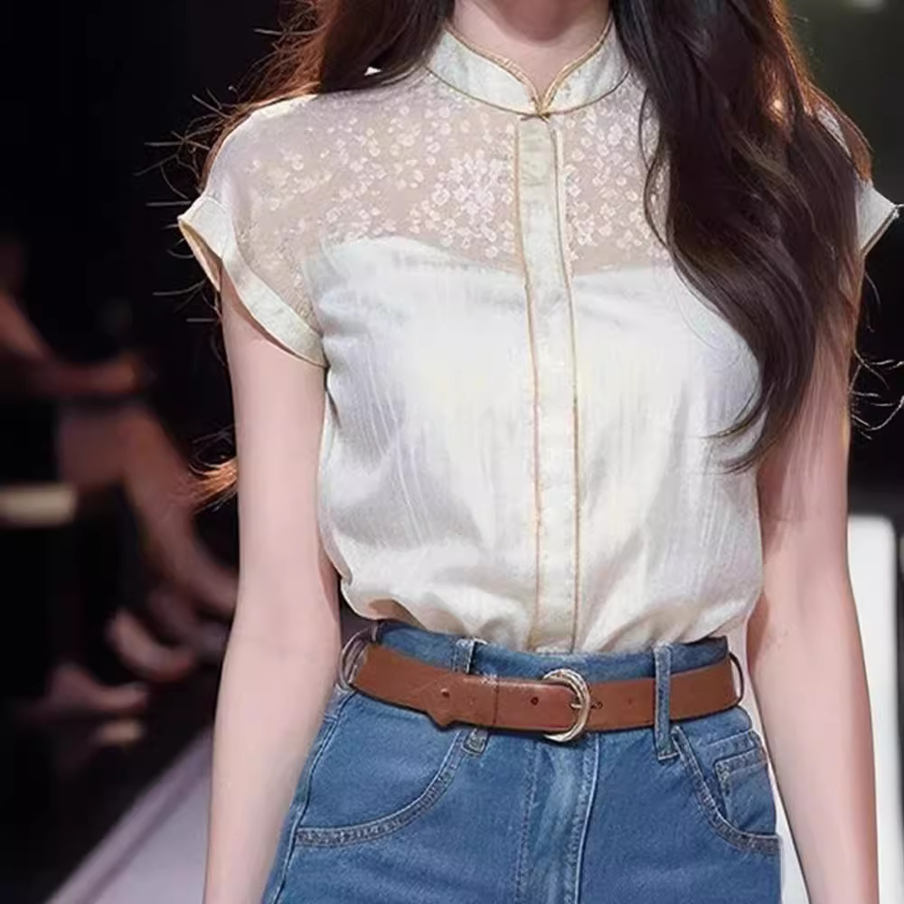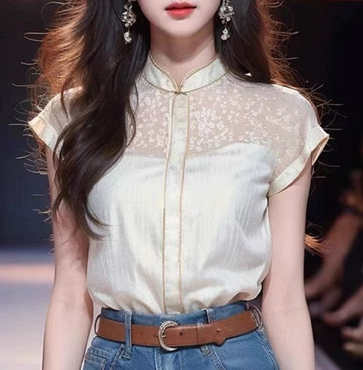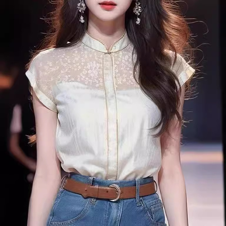 新中式女装别致绝美小上衣米白色国风立领短袖衬衫年春夏新款