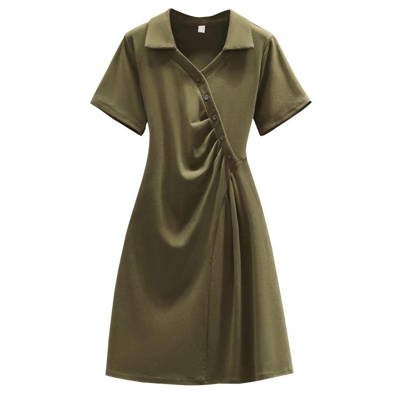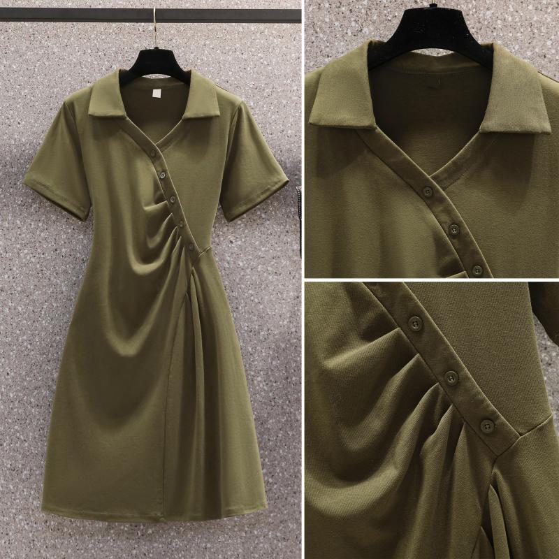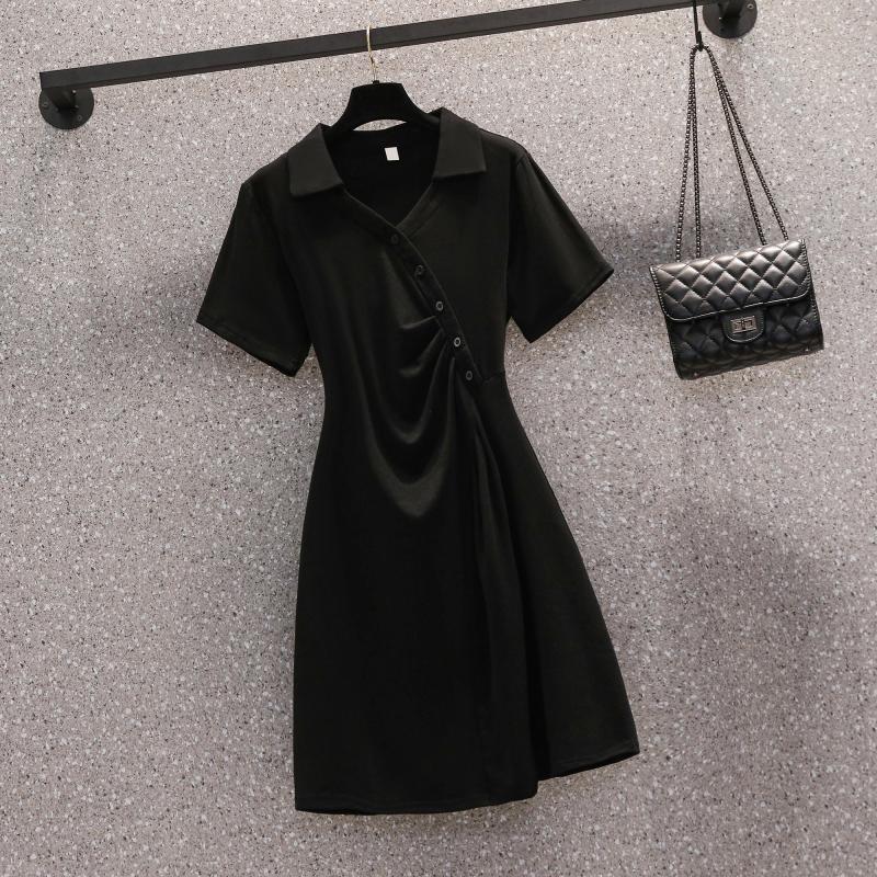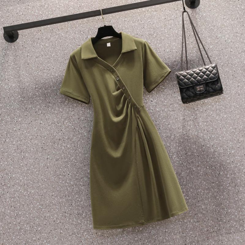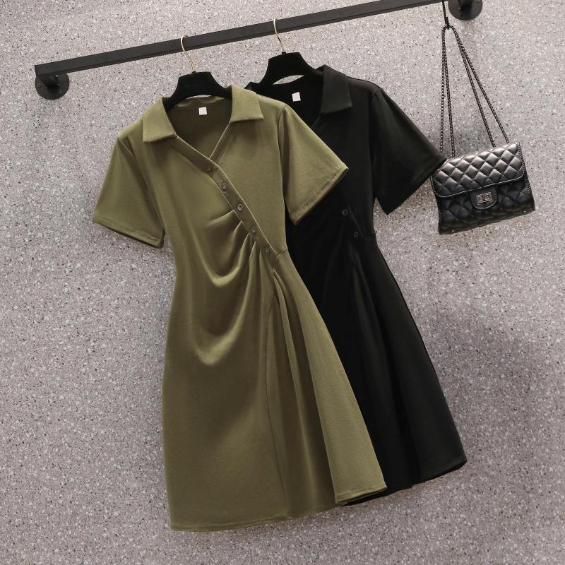 褶皱olo领短袖连衣裙女夏季大码胖mm收腰显瘦遮肚子气质a字裙子