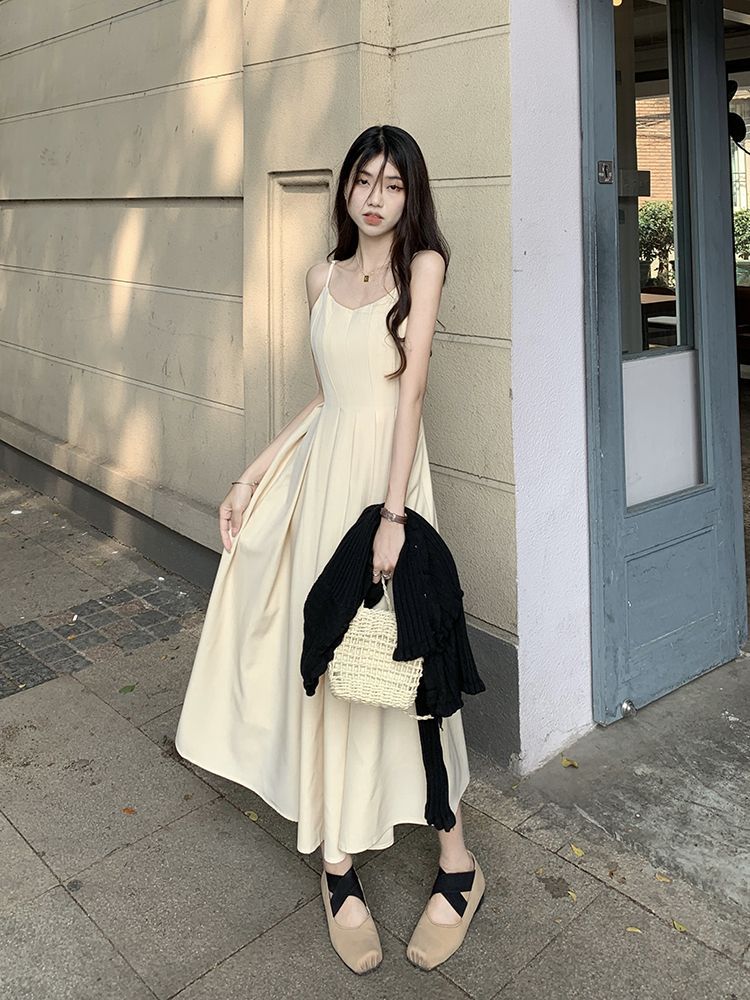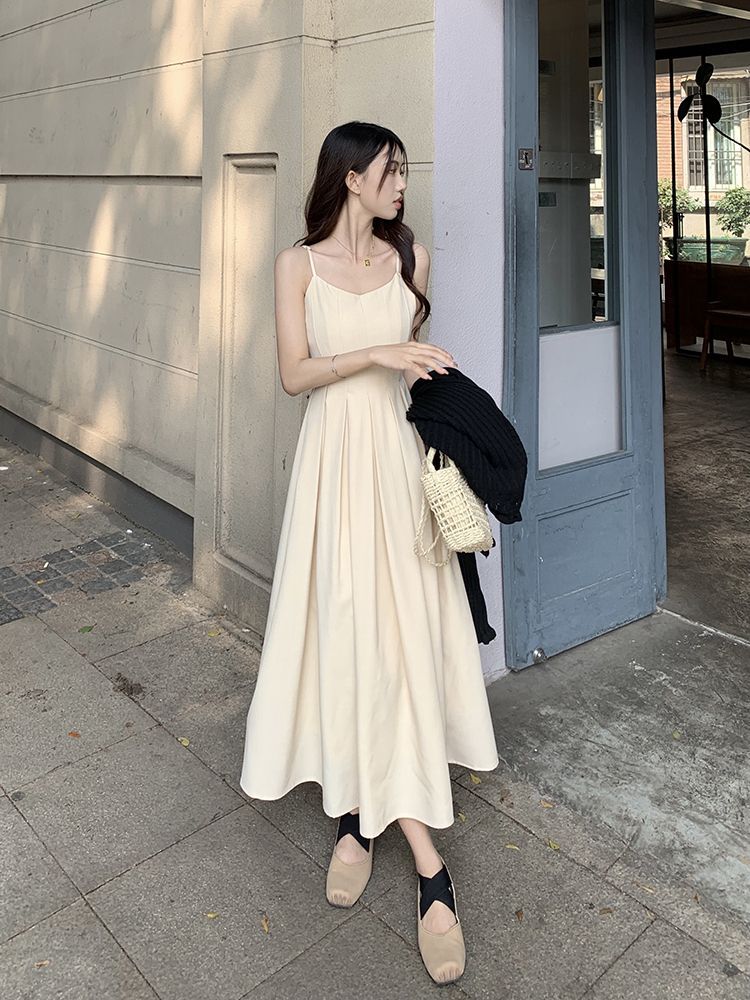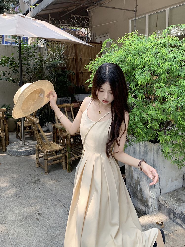 吊带背带连衣裙女夏季高级感无袖设计感小众百褶收腰茶歇法式裙子