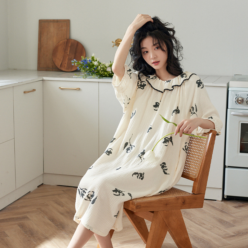 【凉感型】睡裙女夏季纯棉短袖时尚长款可外穿七分袖梭织棉睡衣裙