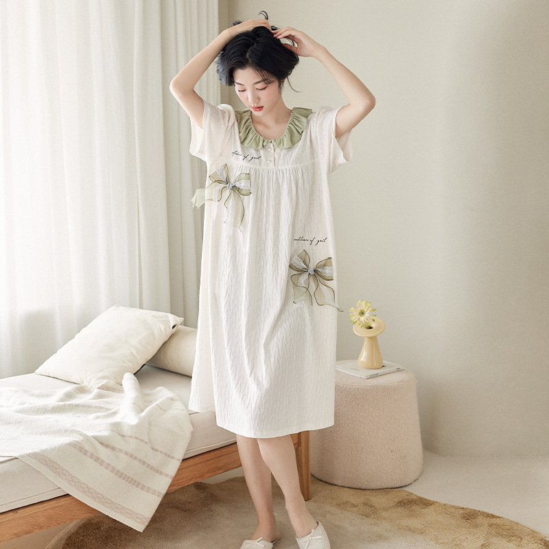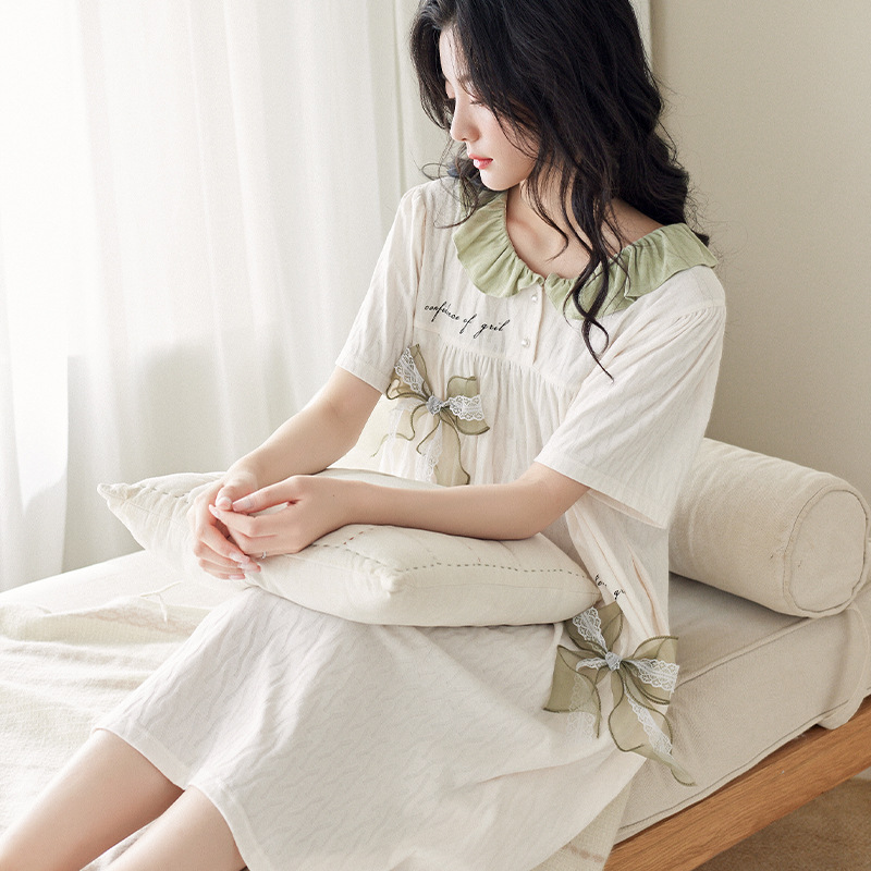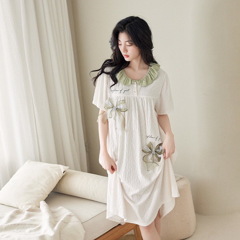 【凉感型】睡裙女夏季纯棉短袖甜美蝴蝶结可外穿长款睡衣裙