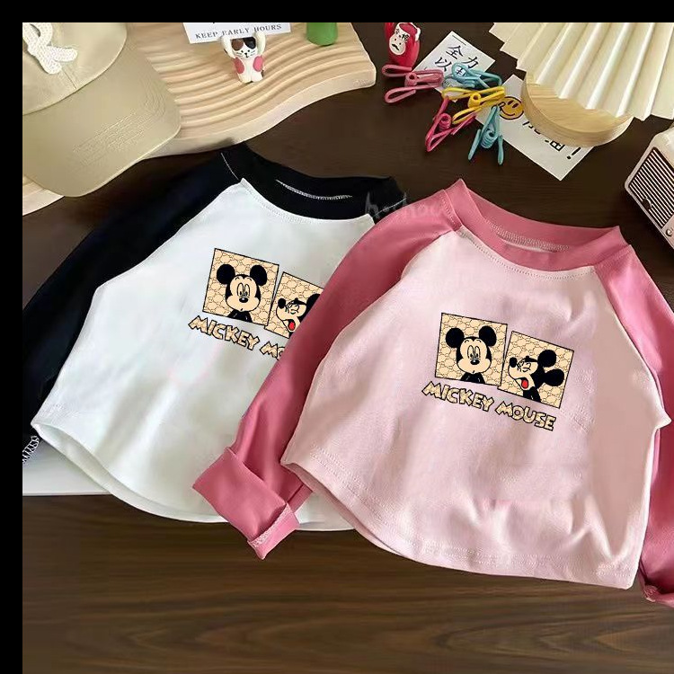 纯棉儿童秋装新款插肩长袖圆领T恤撞色女童卡通上衣宝宝洋气打底