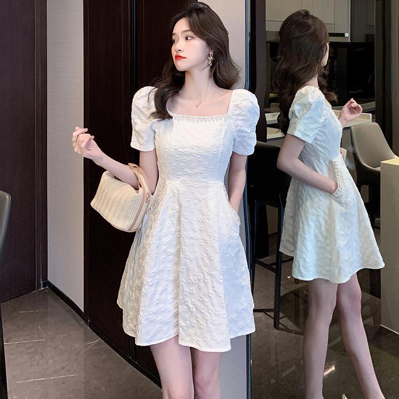 方领法式连衣裙女夏季新款宽松腰撞色休闲收腰显瘦温柔风长裙