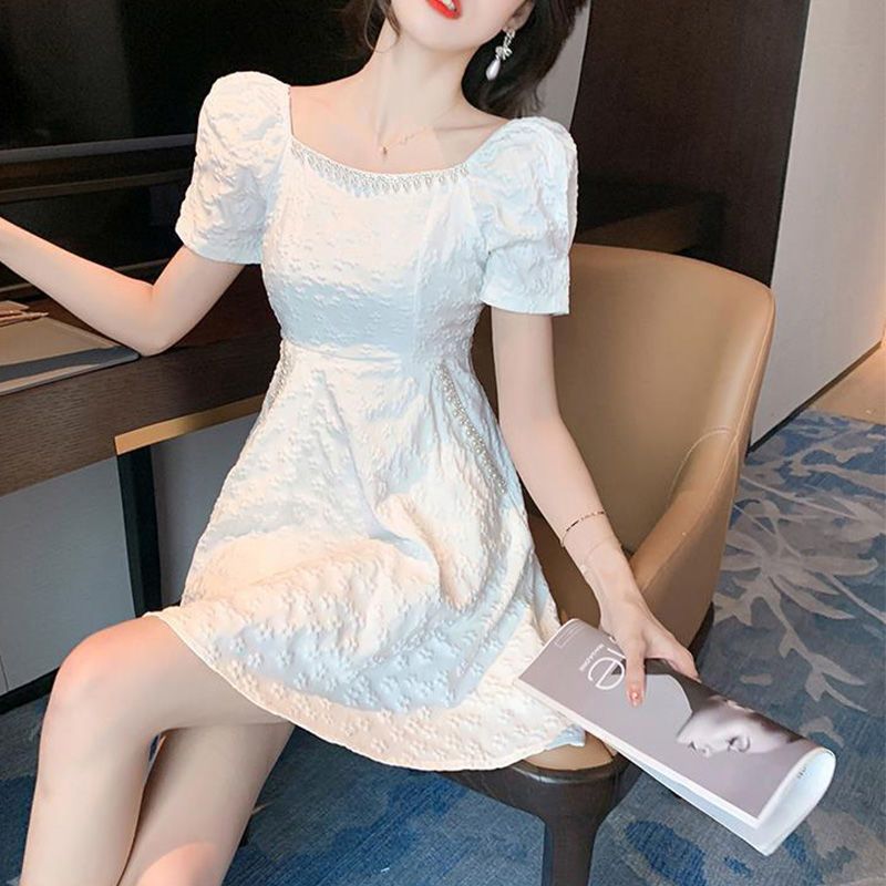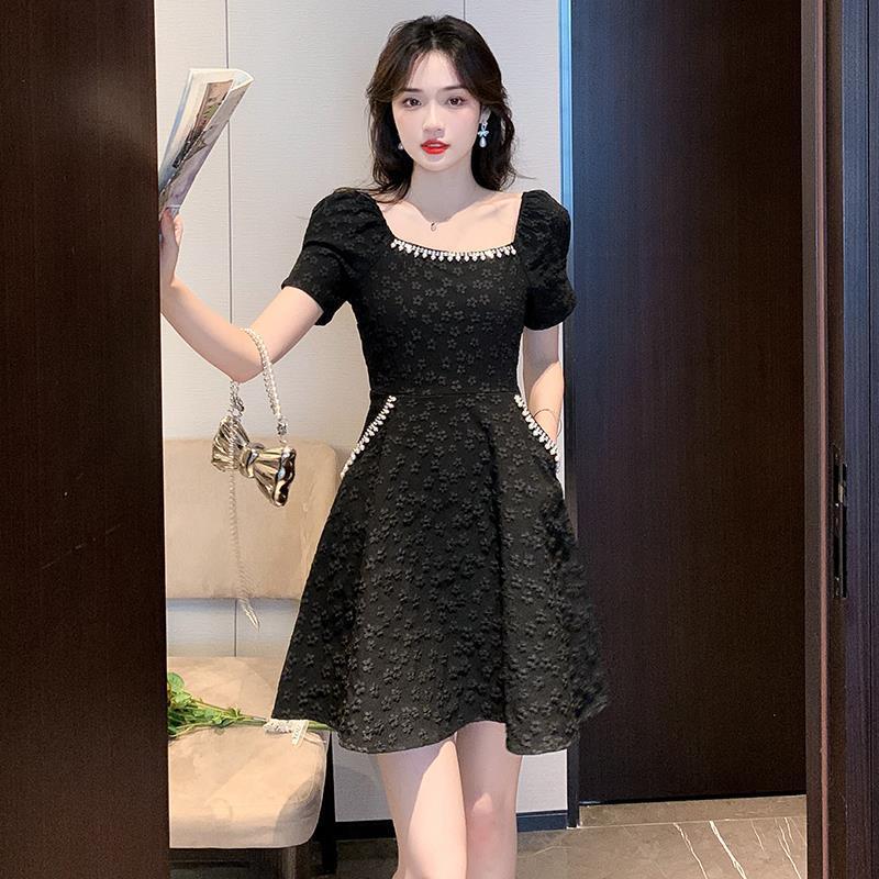 名媛高级感字连衣裙女夏季法式方领收腰裙子轻奢气质显瘦小黑裙