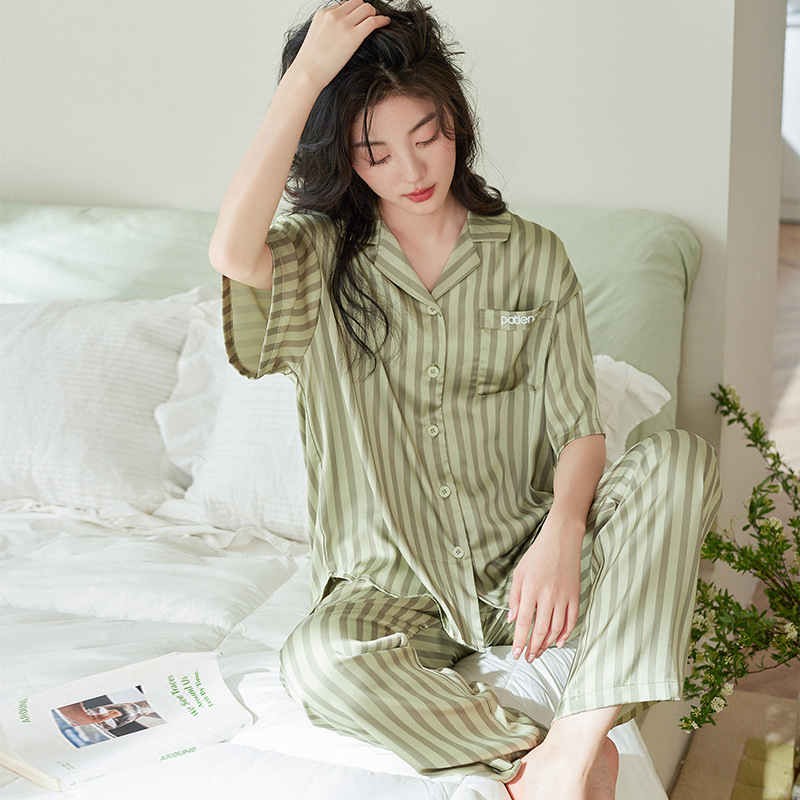 【凉感型】女士睡衣夏季冰丝短袖长裤薄款条纹高级感家居服两件套