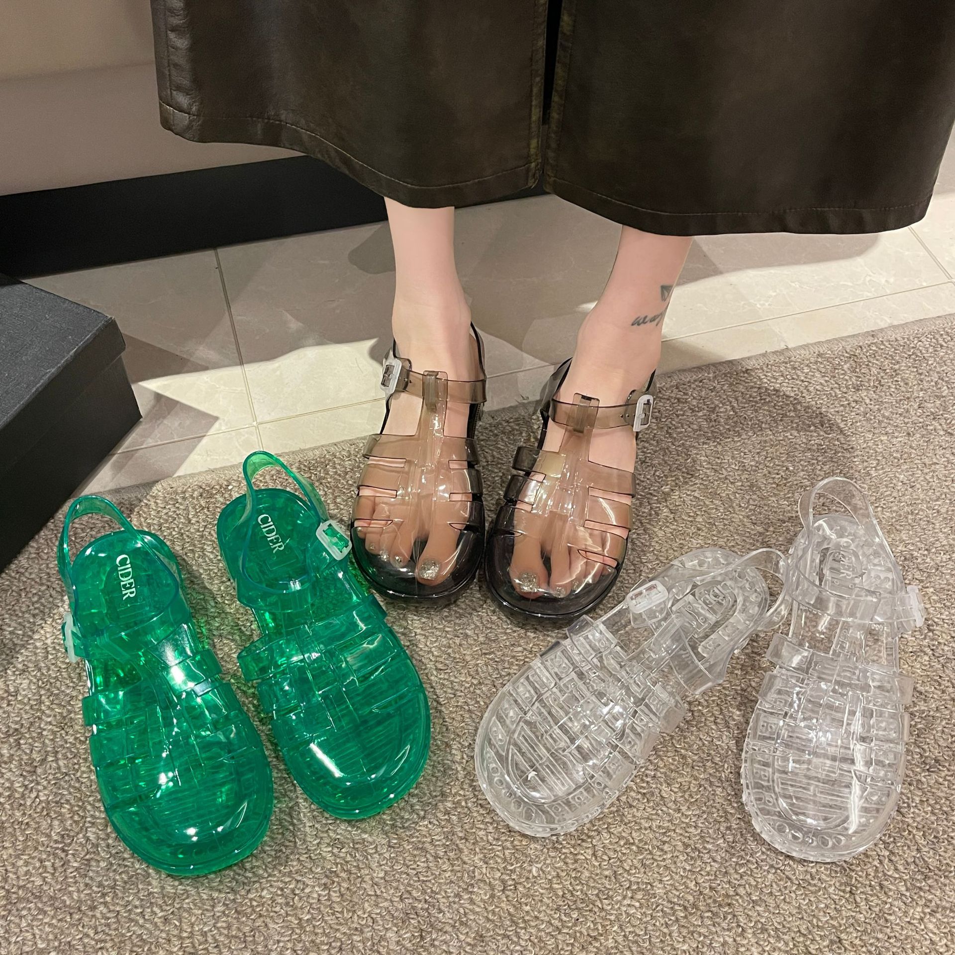 罗马凉鞋网红沙滩休闲包头凉拖鞋时尚欧美厚底搭扣女士水晶果冻鞋