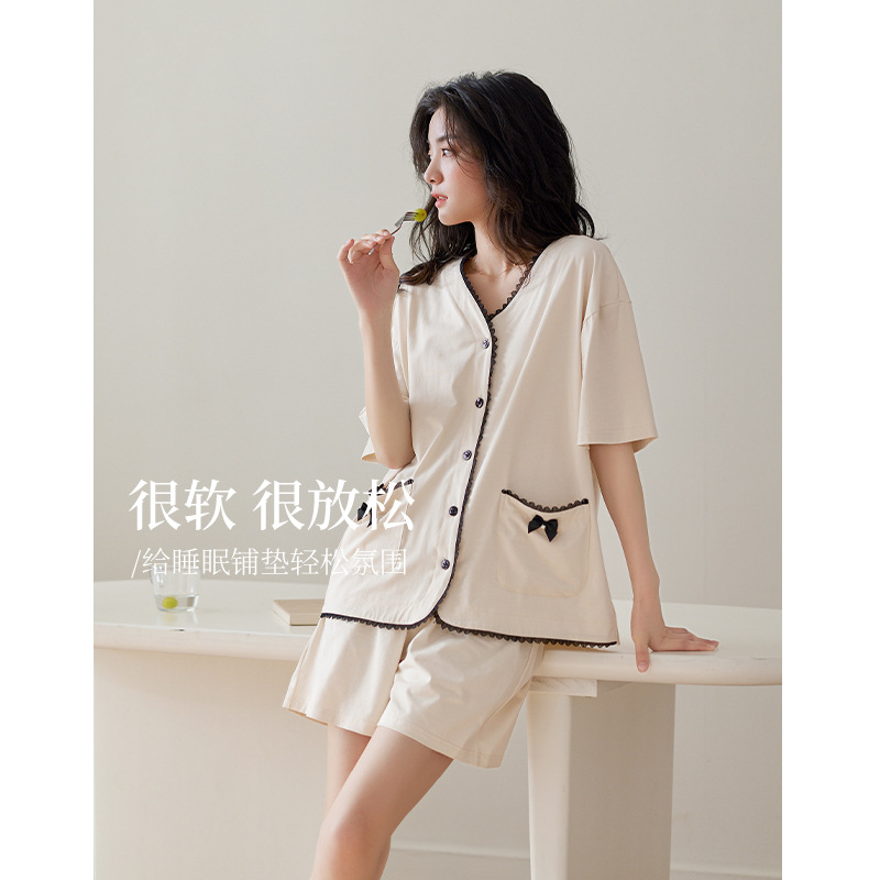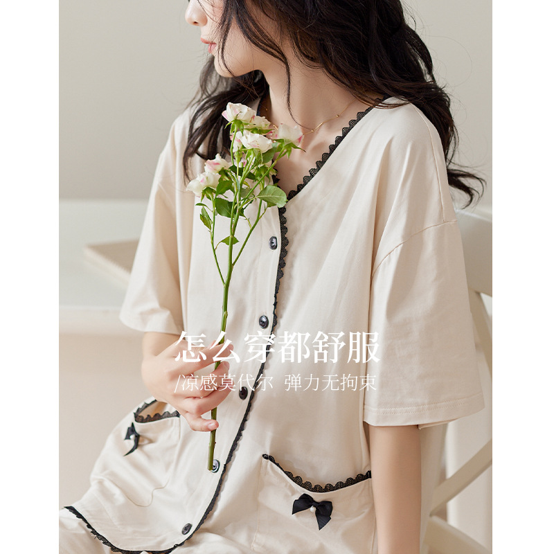 夏天睡衣女士莫代尔棉短袖薄款休闲时尚V领冰凉感短裤家居服套装