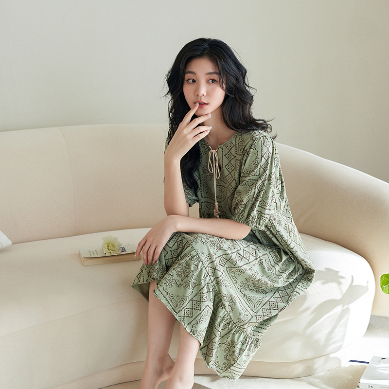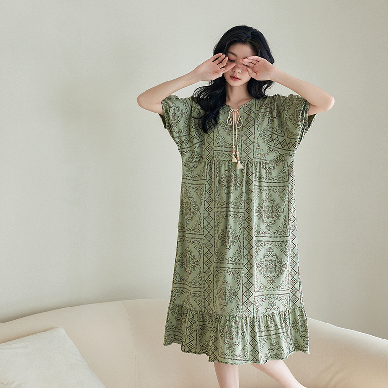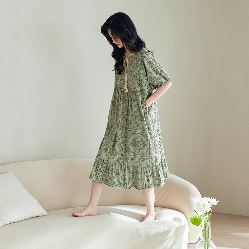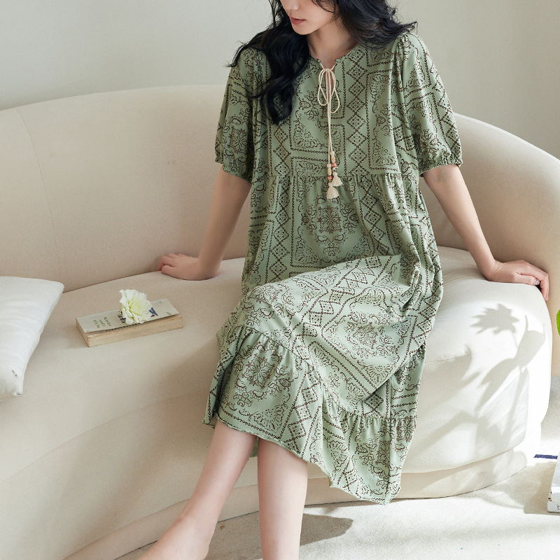 【凉感型】睡裙夏季女款短袖纯棉时尚民族风可外穿长款睡衣连衣裙